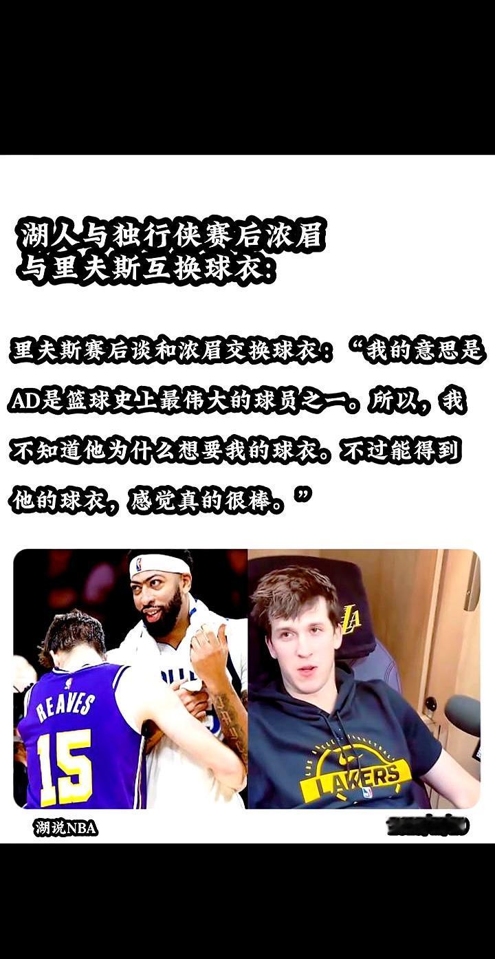 湖人与独行侠赛后浓眉与里夫斯互换球衣: 里夫斯拿着浓眉的球衣,嘴里还在念叨,说浓眉是篮球史上最伟大的球员之一,他真搞不懂人家为啥会要自己的球衣。 浓眉就是用这种方式表达了对他的认可,所以里夫斯才会一边说着“我不知道他为什么想要我的”,一边又把能得到偶像的球衣当成一件天大的喜事。