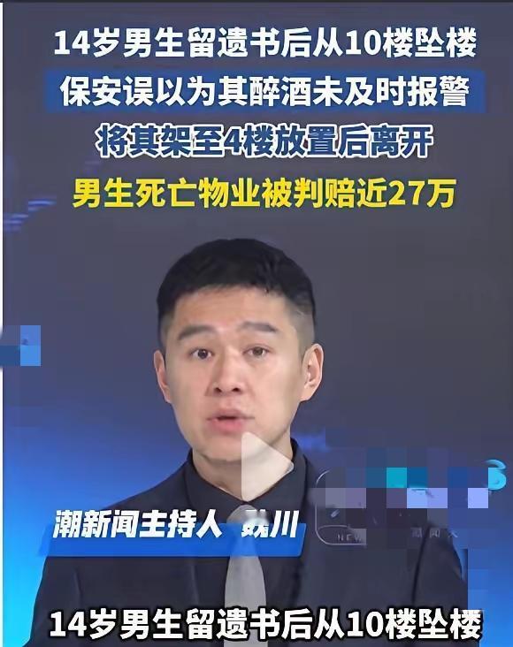 河南一14岁男孩从10楼跳楼自杀,侥幸没死。一保安路过以为他是喝醉了,问男孩住哪。误将“10楼”听成了“4楼”,将其送到4楼后自行离去。男孩家属找到人时为时已晚,跟物业索赔84万…… 保安把坠楼当醉酒、听混楼层还随意搬动,看似好心实则失职——高空坠落者哪能乱扶?最后判赔偿小赵父母损失254027.4元和精神抚慰金15000元。 保安没有及时发现异常,造成二次伤害,违背了物业的安全保障义务。 而父母与孩子的矛盾让孩子走上绝路,也暴露了青少年心理关怀的缺失。 这事儿给所有人敲了警钟:保安执勤不能凭经验,遇到不明状况先叫专业救援;家长更要重视孩子的情绪疏导,别让琐事变成压垮孩子的最后一根稻草。 你觉得物业30%的责任判得合理吗?来评论区聊聊!跳楼事故