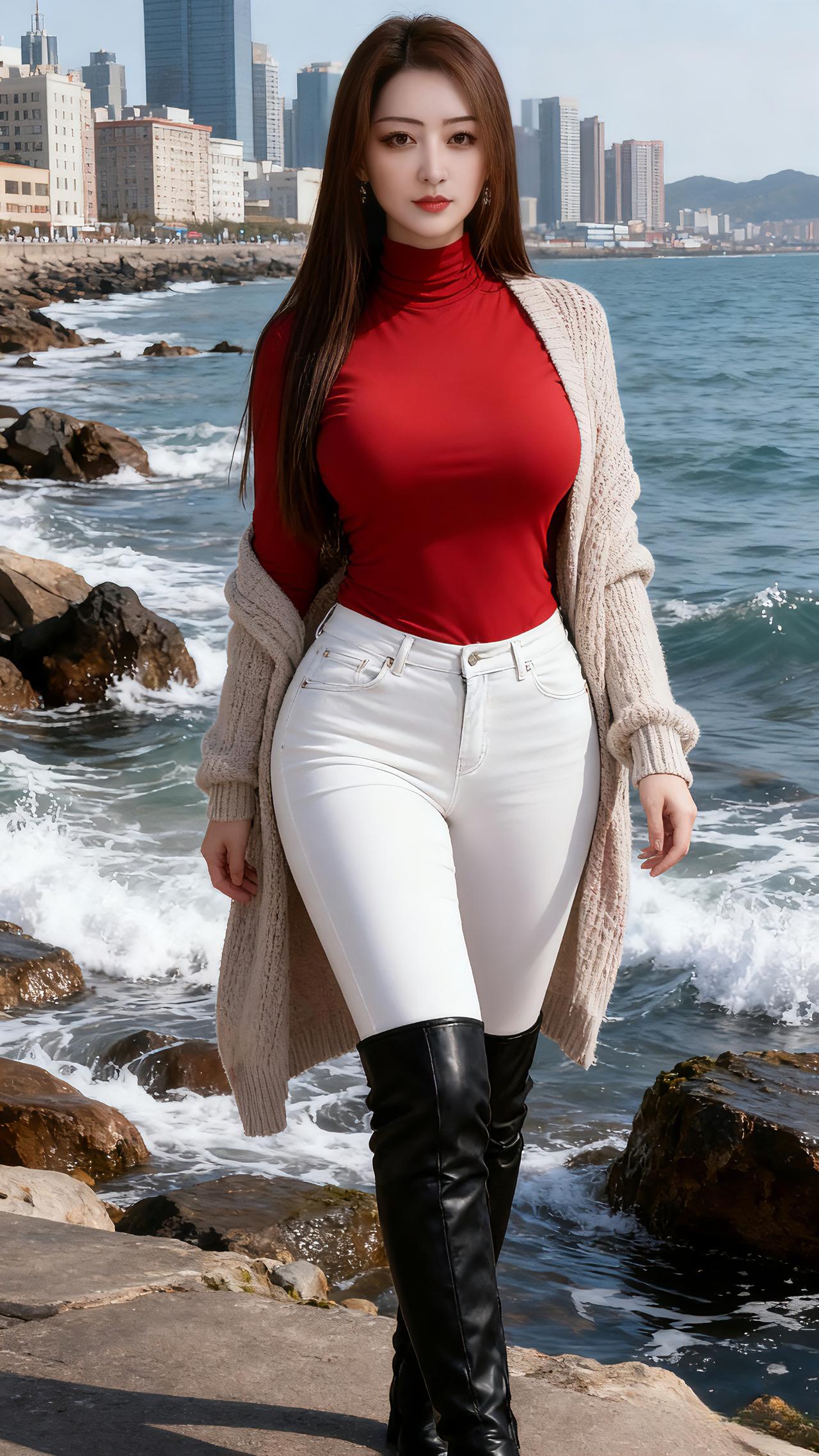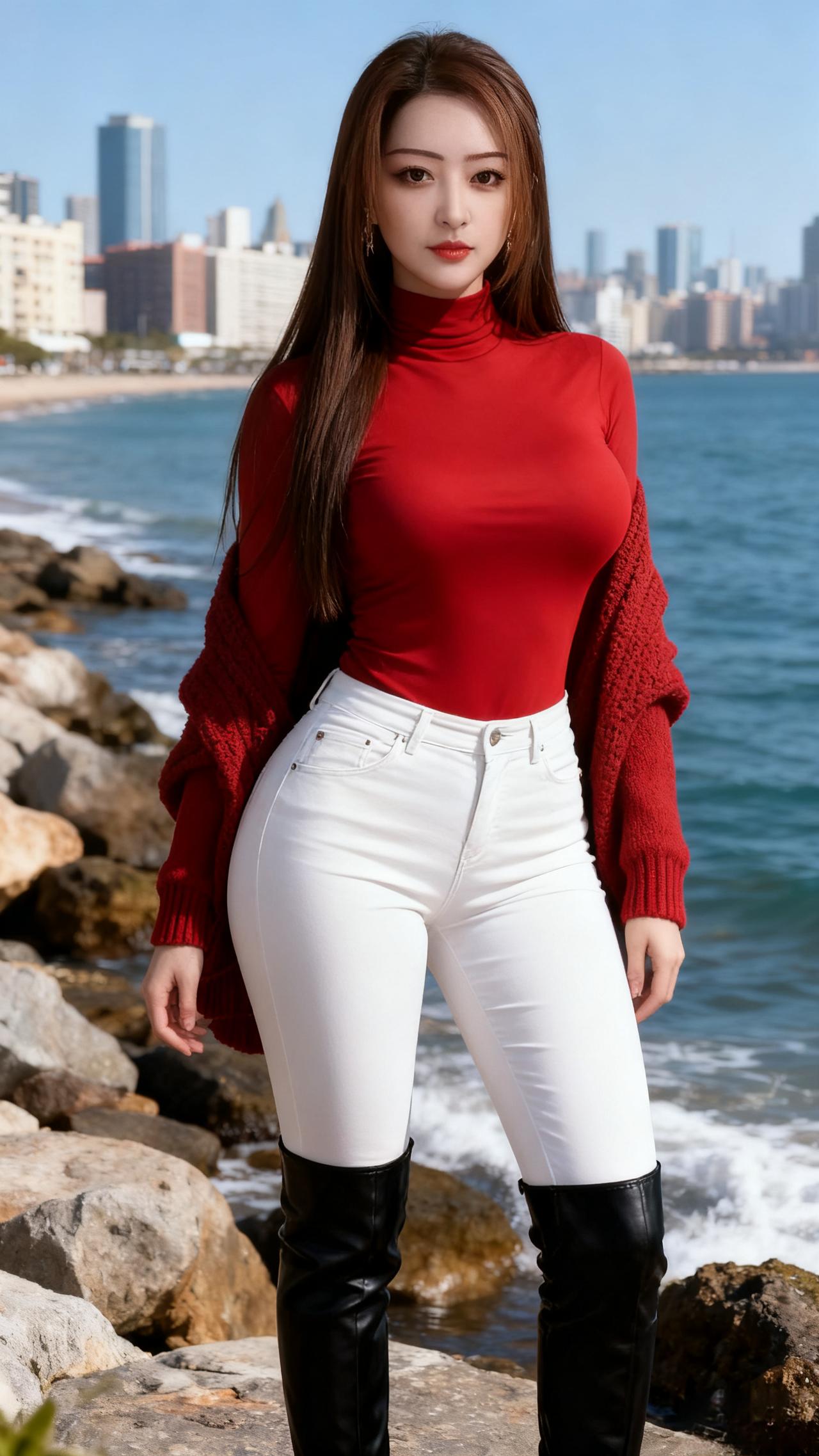 明艳都市休闲风:正红色高领紧身打底衫,完美勾勒身形曲线,搭配同色系粗线针织开衫,慵懒中透着热烈;下装选高腰白色紧身牛仔裤,利落提腰线,再踩一双黑色过膝皮靴,酷飒感拉满。整体红与白撞色吸睛,适配海滨都市背景,明艳又不失日常松弛感,很适合秋冬出街。