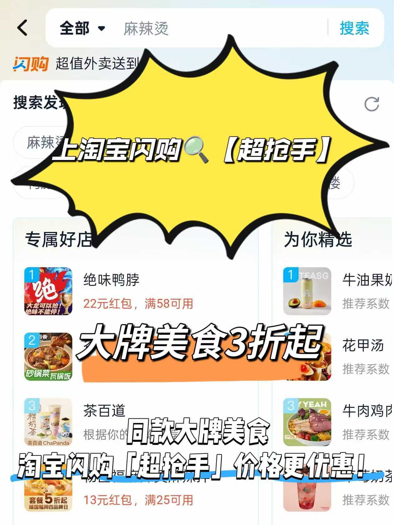 感恩节周末,夜宵就得麻辣过瘾!感谢姐妹们的深夜陪伴,一起嗨聊一起辣! 让你辣得过瘾!绝味鸭脖黑鸭解馋三件套原来36元,现在超抢手21.2元起,鸭脖辣得嘶哈嘶哈也停不下来;海底捞下饭火锅菜冒菜套餐原来47.4元,现在超抢手31.3元起,麻辣鲜香,暖身解馋~比小美平台都优惠,让冬日的感恩在火辣的夜宵中沸腾!上淘宝闪购搜【超抢手】,大牌美食3折起!同款大牌美食,超抢手价格更优惠!你的麻辣夜宵标配是啥?快来评论区辣翻我!