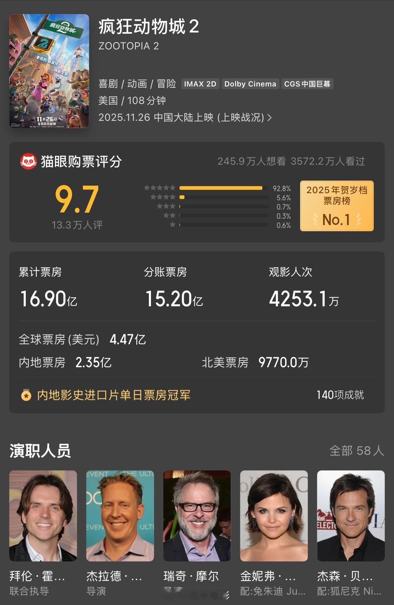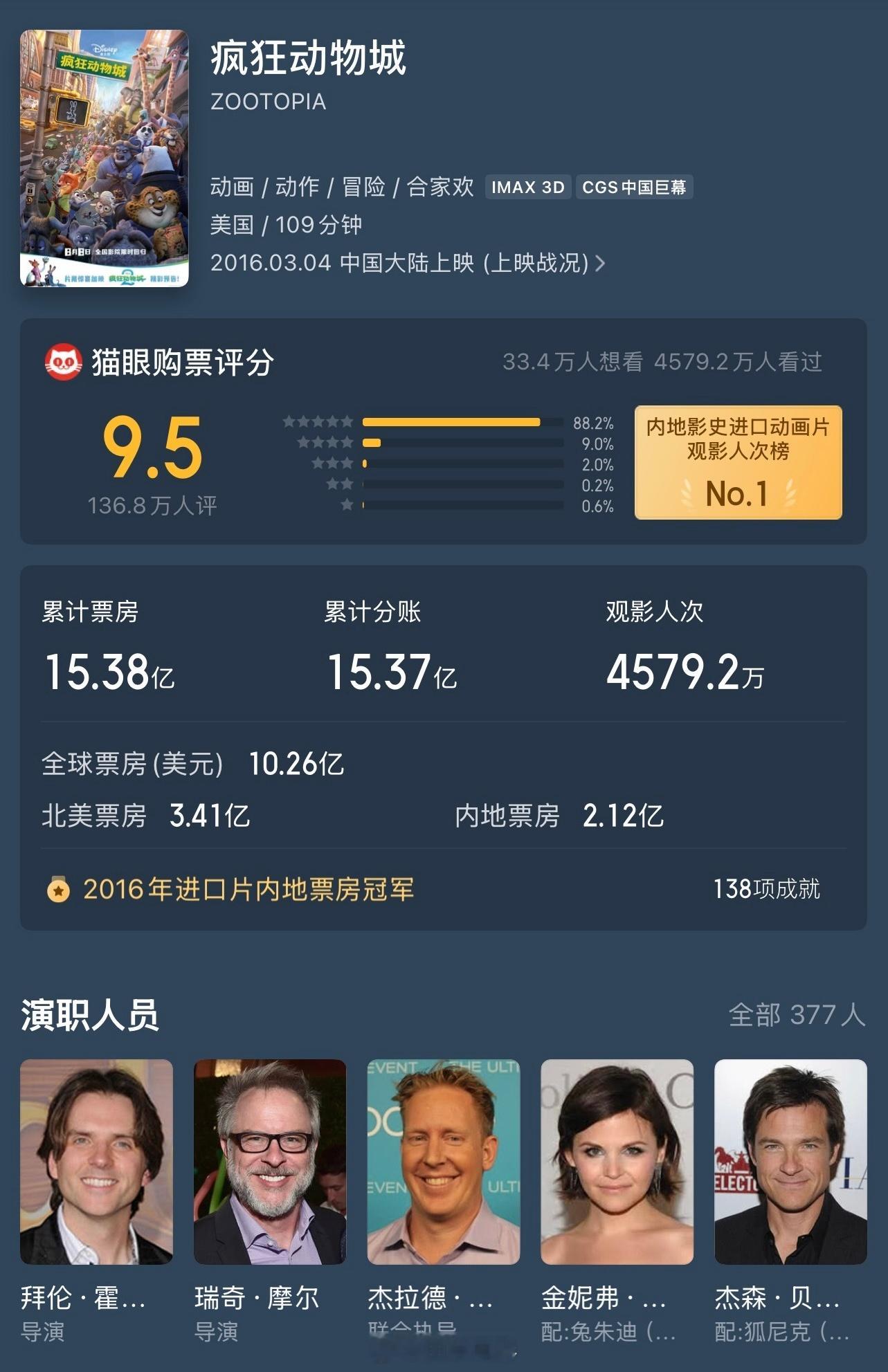 疯狂动物城2票房《疯狂动物城2》够疯狂!票房5天超过第一部(15.38亿),内地票房预测达到42.63亿,要知道2019年上映的《复联4》,目前是内地卖座最高的引进片,那么《疯狂动物城2》能否超越《复仇者联盟4》呢?我们等着瞧吧!佳片奇遇季