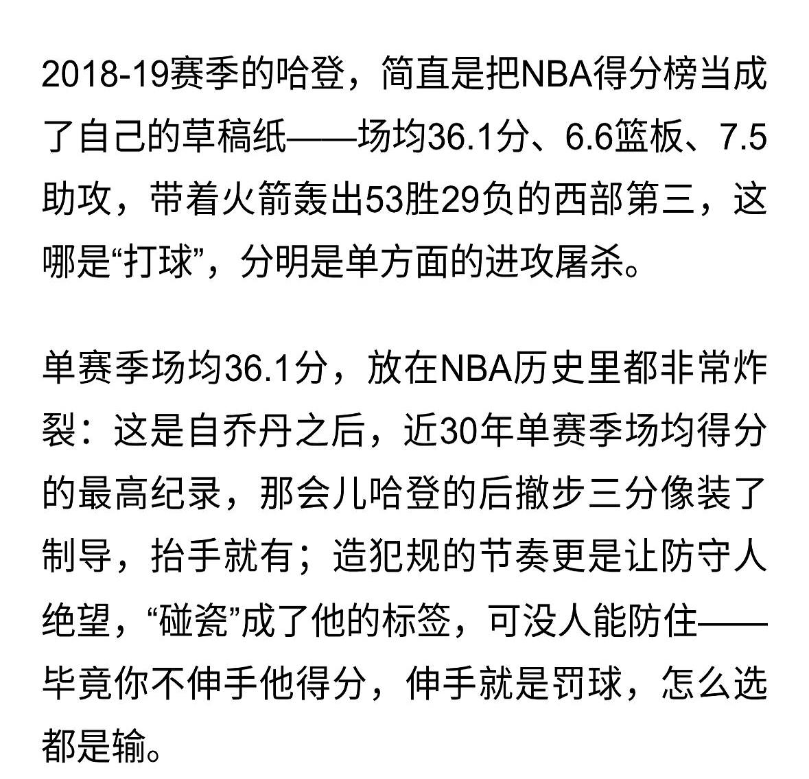 登峰造极!18-19赛季的哈登:把得分玩到天花板的 那时候保罗和卡佩拉都倒下了,他只能一个人扛着球队往前走,一场接一场地轰下高分,硬是把球队从西部倒数的位置拉了回来。 所以他把所有的进攻武器都用了出来,用那些不讲理的三分球为球队续命,也把自己燃烧成了那个赛季最耀眼的一道光。