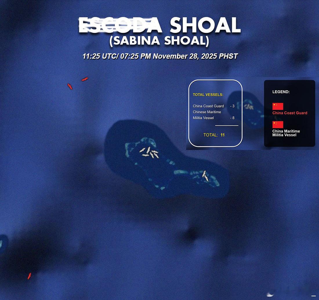 仙宾礁前天态势,礁外有3艘中国海警舰艇,潟湖内则有8艘“民兵船”。南海态势