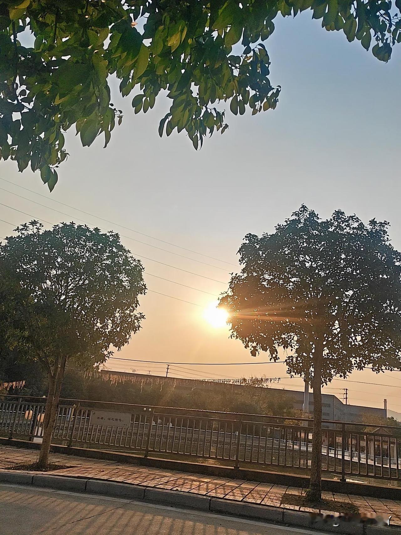 暮色把天边晕成浅金,风把树叶摇得沙沙响,光影在柏油路上晃成细碎的网。 太阳正从两棵树的枝桠间沉下去,把叶片的轮廓烫成暖黄,连空气里都浮着一层绒绒的光。栏杆在砖路上投下斜长的影子,远处的建筑和电线都浸在温柔的雾里,像被谁轻轻揉软了边角。 此刻没有喧嚣,只有风掠过耳畔,把这片刻的暖光,妥帖地放进心里。