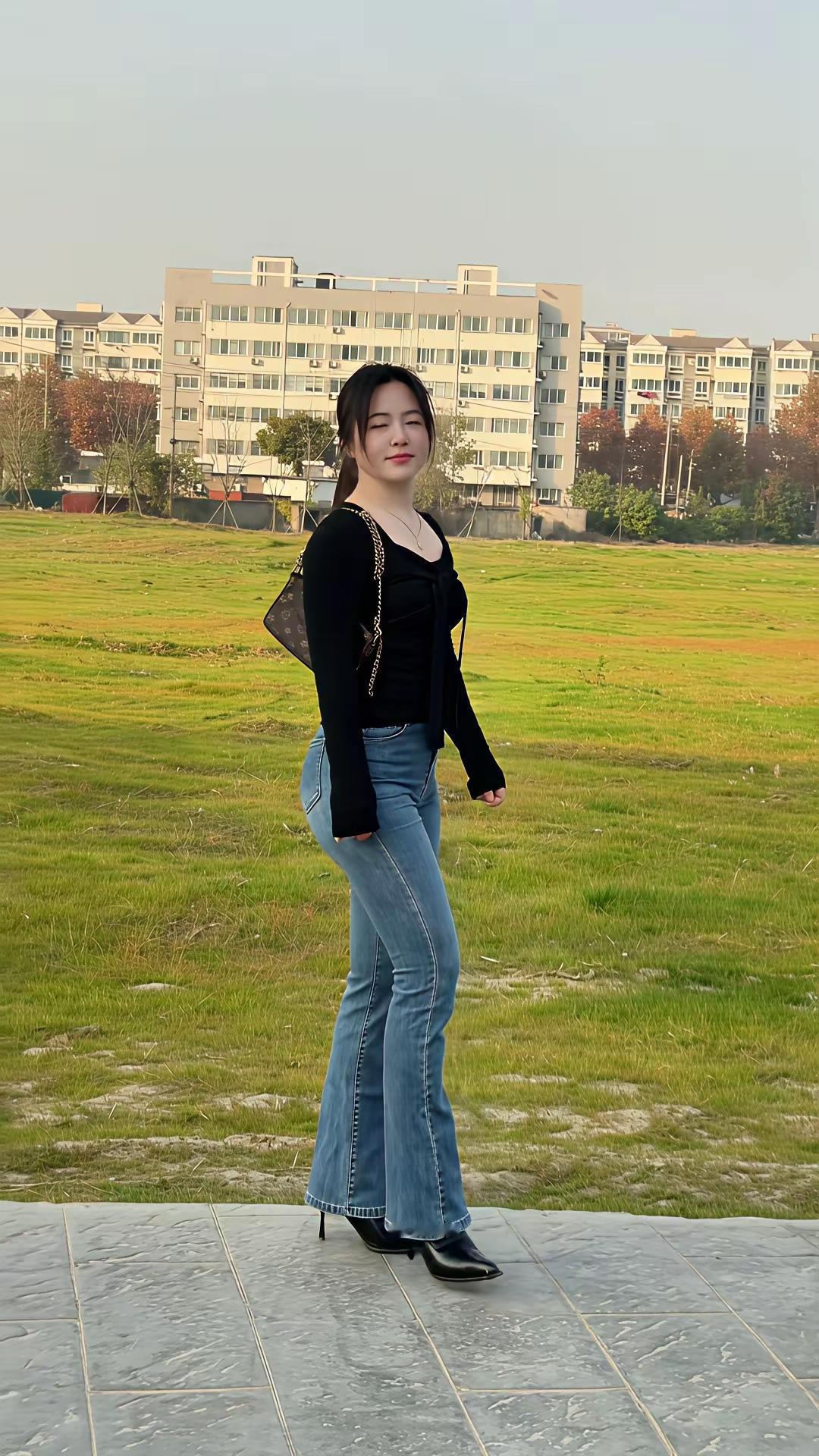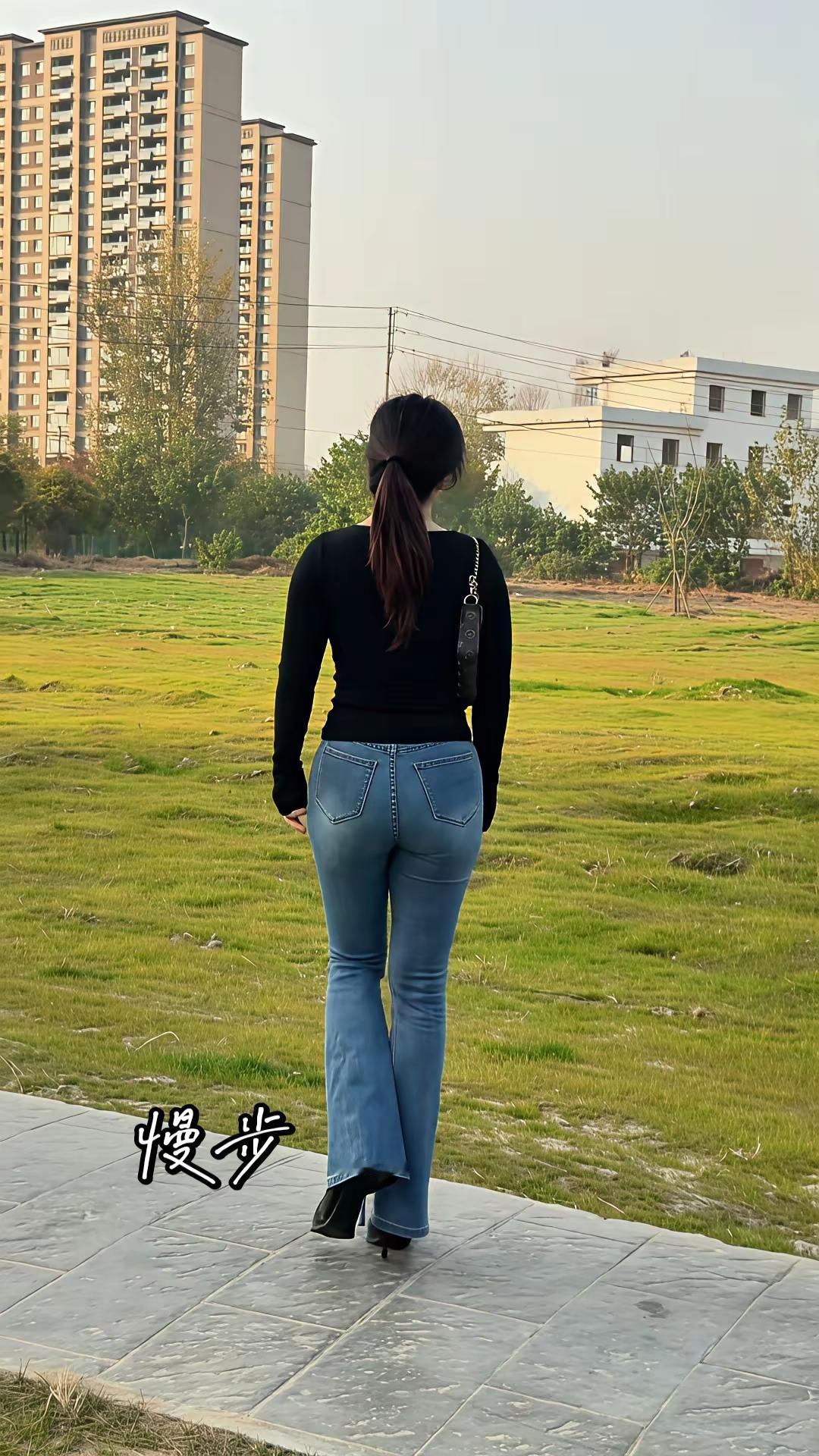 小区里慢步牛仔裤穿搭