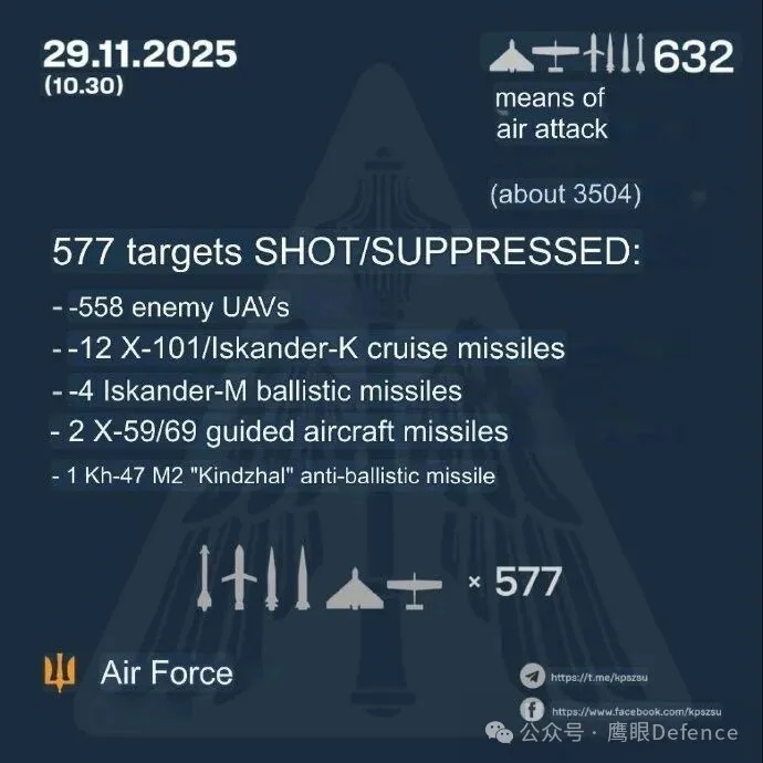 烽火问鼎计划 当地时间28日21点59分到29日8点27分,俄罗斯军队对乌克兰发动了本月第三次大规模空袭,持续近10个小时,重点打击基辅以及周边地区。根据乌克兰空军发布的战报,俄军发射了596架无人机、5枚“匕首”空射弹道导弹、23枚KH-101和“伊斯坎德尔-K”巡航导弹、4枚KH-59/69巡航导弹和4枚“伊斯坎德尔-M”弹道导弹,乌克兰防空部队成功击落了其中的558架无人机、1枚“匕首”、12枚KH-101或“伊斯坎德尔-K”、全部4枚“伊斯坎德尔-M”和2枚KH-59/69,俄军本次空袭的主要目标是乌克兰能源基础设施和民用设施,尽管乌军防空部队取得了较高拦截率,但突防成功的俄军导弹和无人机依然给乌克兰造成了严重破坏和人员伤亡,截至撰文时,综合乌克兰政府发布的信息以及网络信息,确认乌克兰多处能源基础设施被毁、城市大范围停电停暖,至少7位平民在空袭中遇难、至少21人受伤,目前救援行动正在紧急进行中,基辅市政府已要求寒冷天气下断暖的居民尽快前往避难点。乌克兰政府将本次空袭定性为“针对平民的蓄意恐怖袭击”,再次强调必须通过强化防空和持续的国际支持来迫使俄罗斯停止这类空袭,多国外交使团对乌克兰表达慰问并谴责俄罗斯军队针对民用基础设施的蓄意袭击。