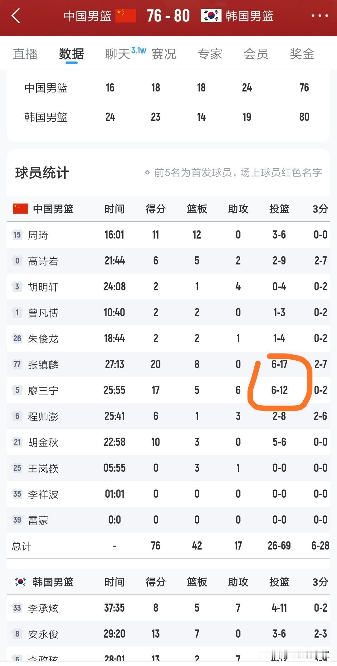 不知道说的对不对,中国男篮输韩国,世预赛首战失利,郭士强犯了一个错误,就是把张镇麟和廖三宁当中国男篮的核心来用,我觉得这是个大忌,看一下数据,张镇麟17投6中,出手和得分全队最高,但是效率极低。试想一下,张镇麟离开国家队近两年时间,连男篮亚洲杯都缺席的球员,世预赛首战就给足了球权,这是什么概念?依我所见,张镇麟顶多是一个3D球员,主要扮演防守悍将角色,进攻端偶尔客串一下得分手,把他当球队核心用,可能赢不了比赛。至于廖三宁,他的打法相对独一点,一打四看,拿球就是自己干,对球队陷入得分难的困境时是奏效的,但是这种打法整体对球队而言,弊大于利,如果投篮命中率不高的话,对球队的伤害更不小的。