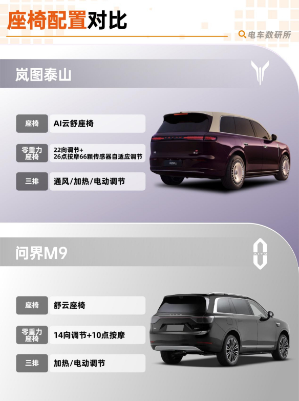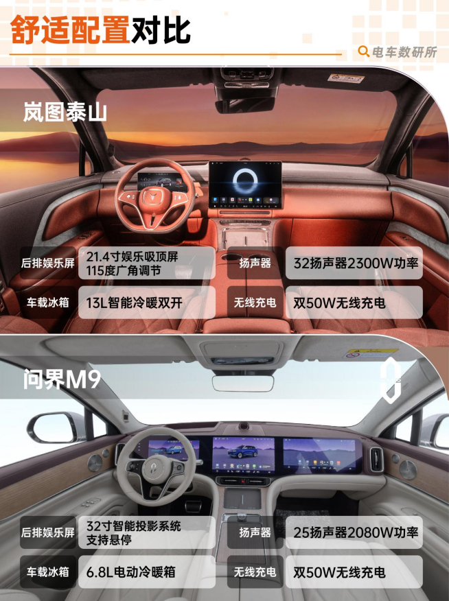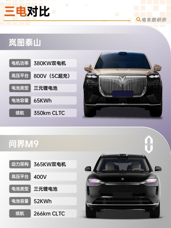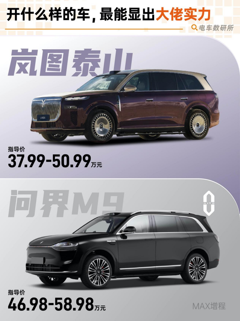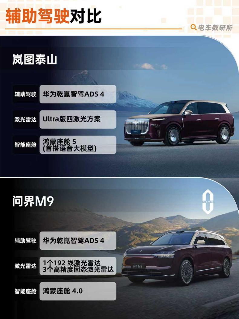 问界M9上市后,几乎成了五十万级别豪华SUV的标杆。但市场从来不止一个主角,岚图泰山的出现,又把这个级别的竞争推回白热化。岚图泰山和问界 M9有何差异?一文讲清楚。✅续航&补能️岚图泰山,搭载65度电池+800V超混平台,纯电能跑350km,城市通综合续航1400km+, 长途无焦虑,日常通勤基本不用油,把它当成一台纯电车开都没问题。️问界M9,52.3度+400V平台电池,支持266km纯电续航,综合续航1000km+,全场景出行也能稳稳覆盖。✅操控&底盘岚图泰山搭载国内首搭三腔空气悬架 + EDC魔毯功能,这套空悬,软的时候够软,硬的时候够硬,城市里开着舒服,高速也有操控感。结合双向16度后轮转向,5.4m转弯半径,市区双车道不仅能“一把掉头”,还有“蟹行”挪车模式,非常灵活。问界M9:单腔空悬+CDC连续阻尼控制,过弯刹车不晃不点头:这车大但过弯不笨重,悬架能变硬撑住车身,减少倾斜;刹车时也能稳住车身,不会出现猛地往前栽头的情况,开着很稳。走烂路几乎不颠,提前扫描路况,快速调整状态,坐在车里基本没啥颠簸感。✅智驾&座舱️泰山搭载华为乾崑智驾ADS 4,Ultra版搭载华为乾崑智驾 ADS 4四激光方案,世界唯二,再配合鸿蒙座舱 5,它不仅能听懂你说的内容,还能理解你的真实意图,复杂操作一气呵成。问界M9搭载搭载华为乾崑智驾 ADS 4,配备4颗激光雷达与多传感器融合感知方案,无论是城区还是高速表现都非常稳定。鸿蒙座舱 4 系统生态完整、操作逻辑贴近手机,让用户几乎没有学习成本。在同级里一直处于领先。✅价格&定位问界M9:47.98-53.98万岚图泰山:37.99-50.99万11月30日(含)前订岚图泰山,可享价值4万8的首销权益以及跨年提车的购置税兜底保障!趁截止前赶紧锁定权益,机会可失,失不再来。总结:随着泰山的加入,对于消费者来说,可以用更合理的预算,换来更先进的技术和品质。五十万级豪华 SUV 的格局一定会变得更有看头。手握50万,你会选谁?A️⃣ 岚图泰山 B️⃣ 问界M9岚图泰山问界M9新能源大牛说