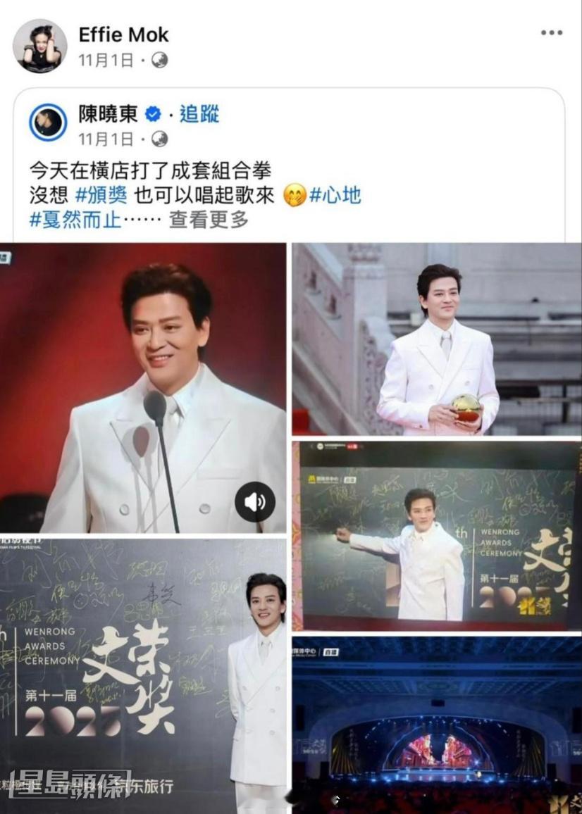 海俊傑太太莫家慈離世丨好友陳曉東早發現對方眼睛呈黃色 大讚Effie貼心有義氣永遠報喜不報憂1994年新秀冠軍海俊傑11月8日在社交網站拍片,失控地爆喊其任職化妝師的老婆莫家慈(Effie)患上急性肝衰竭,急需要籌150萭元進行換肝手術,稱當時已籌得一半,但尚欠一半款項,之後得到古天樂、曾志偉、郭富城與及天盟娛樂培哥等圈中好友幫忙,籌得所需要,但不幸是Effie於本月27日已經病逝。陳曉東自責幫忙有限與海俊傑夫婦份屬好友的陳曉東,指Effie的離世,加上大埔火災情況,接二連三的壞消息特別傷感。在Effie對抗病魔這段期間,他一直有和她的家人聯繫,亦了解對方的情況,並自責自己幫忙不了什麼:「因為始終肝病,其他器官都慢慢惡化,沒法做手術。」他大讚Effie 是一位貼心又有義氣的朋友,永遠報喜不報憂,在患病期間還是積極樂觀,亦很支持他,「佢私底下非常關心我,我在香港時特意煲湯俾我,每次回想起時候都充滿暖意。」陳曉東關心大埔五級火陳曉東又憶起在他舉行演唱會記招,Effie也有特意來撐場,他指當時已經察覺到對方的眼睛呈現黃色,皮膚也出現敏感:「我就叮囑她一定要快點去好好檢查肝臟,雖然我平時不太喝酒,但小時候也中過A型肝炎,所以知道肝病的人眼睛一定是黃。」同時,陳曉東亦非常關心大埔宏福苑五級火,看見社會上很多團體、個別人士都伸出援手,認為香港人還是暖心。