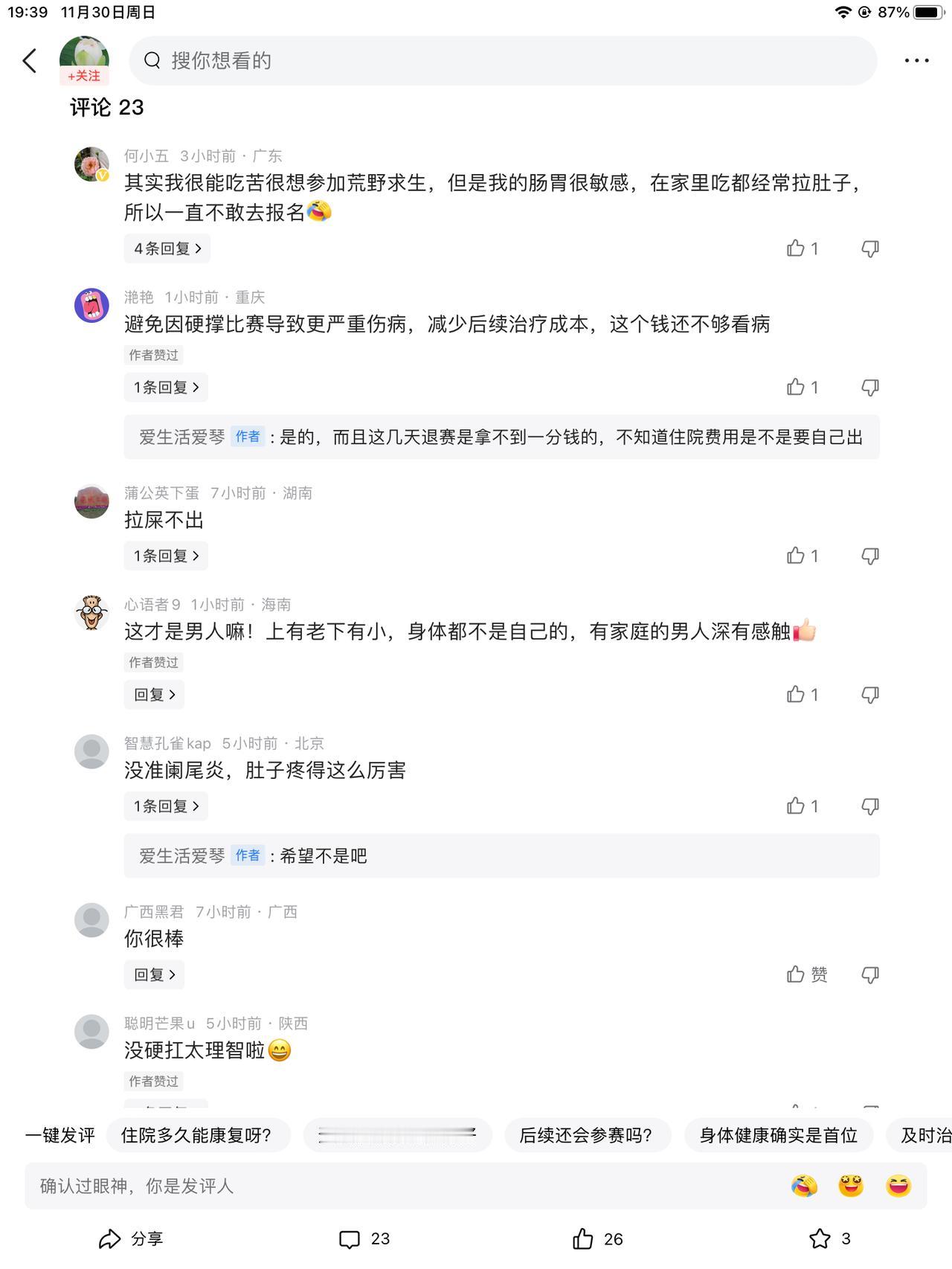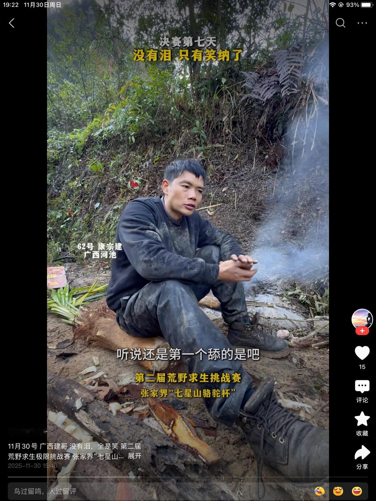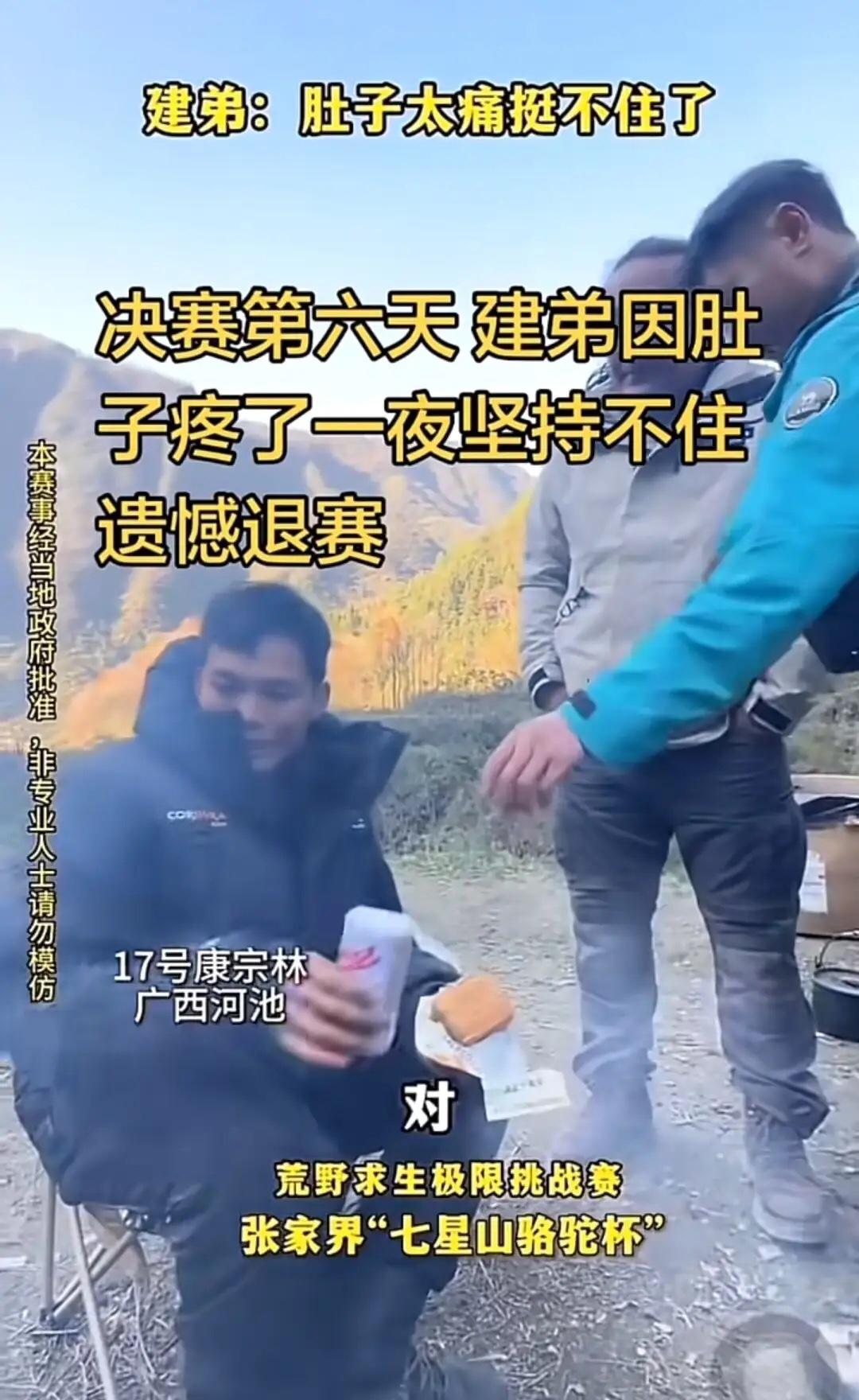 建弟住上院了!肚子疼了一晚上,思前想后还是退赛了!看来还是不舒服。这就对了,荒野求生,不求病。有病了就赶紧下山。都有老有小的。身体才是第一位的。已经很棒了。坚持十天,也不过是两千块钱的事。 扛不久就没必要坚持了。建哥是第一个舔包的。拿着棍子回家了,很开心。让你吃好喝好。没遗憾。都有状况。还有至今没生到🔥的,没物资,大家都吃草,有一个弄到丰巢了。林北看到山药没有工具,回家拿,回来发现被苗王捷足先登了。很有意思。