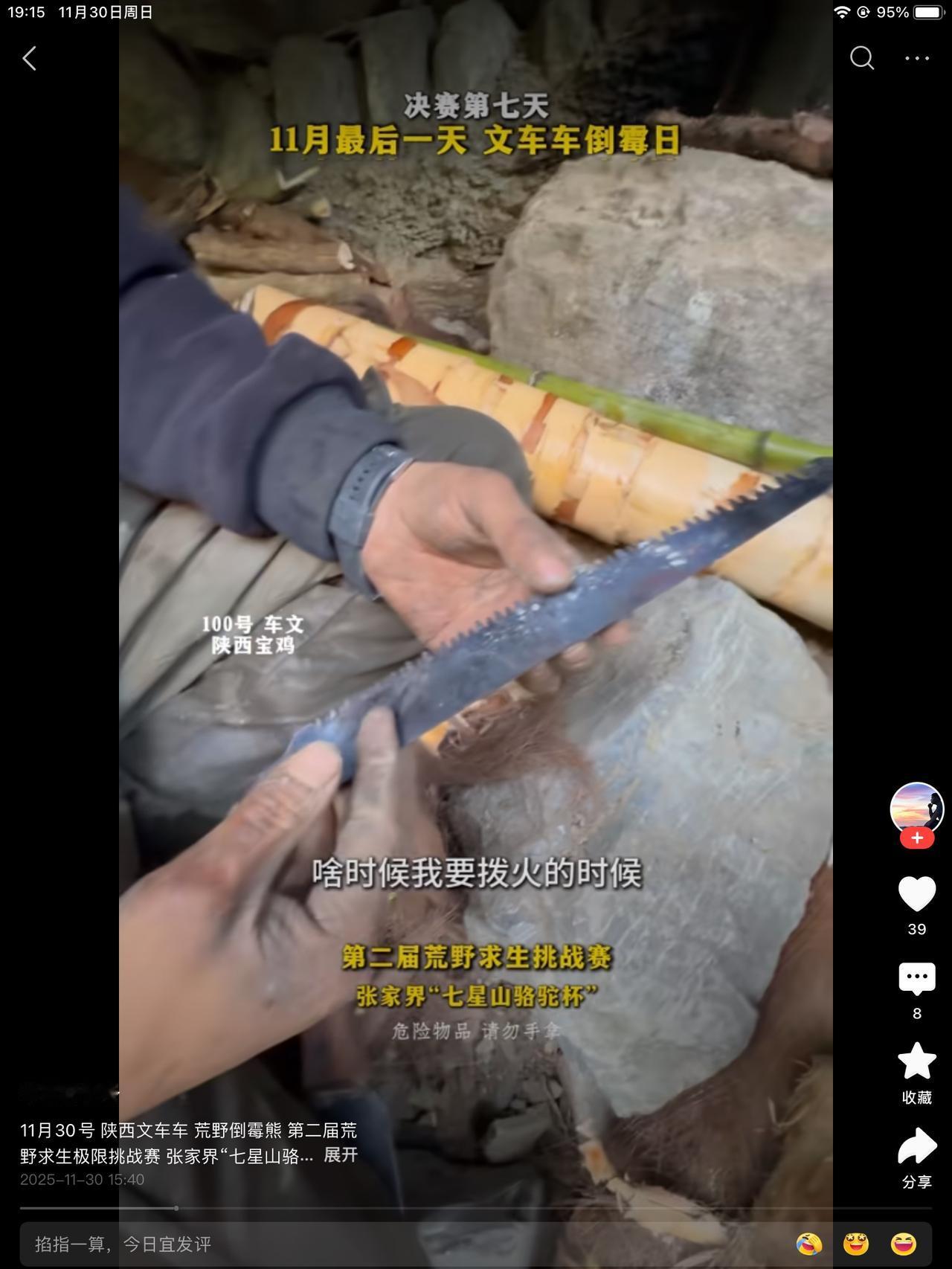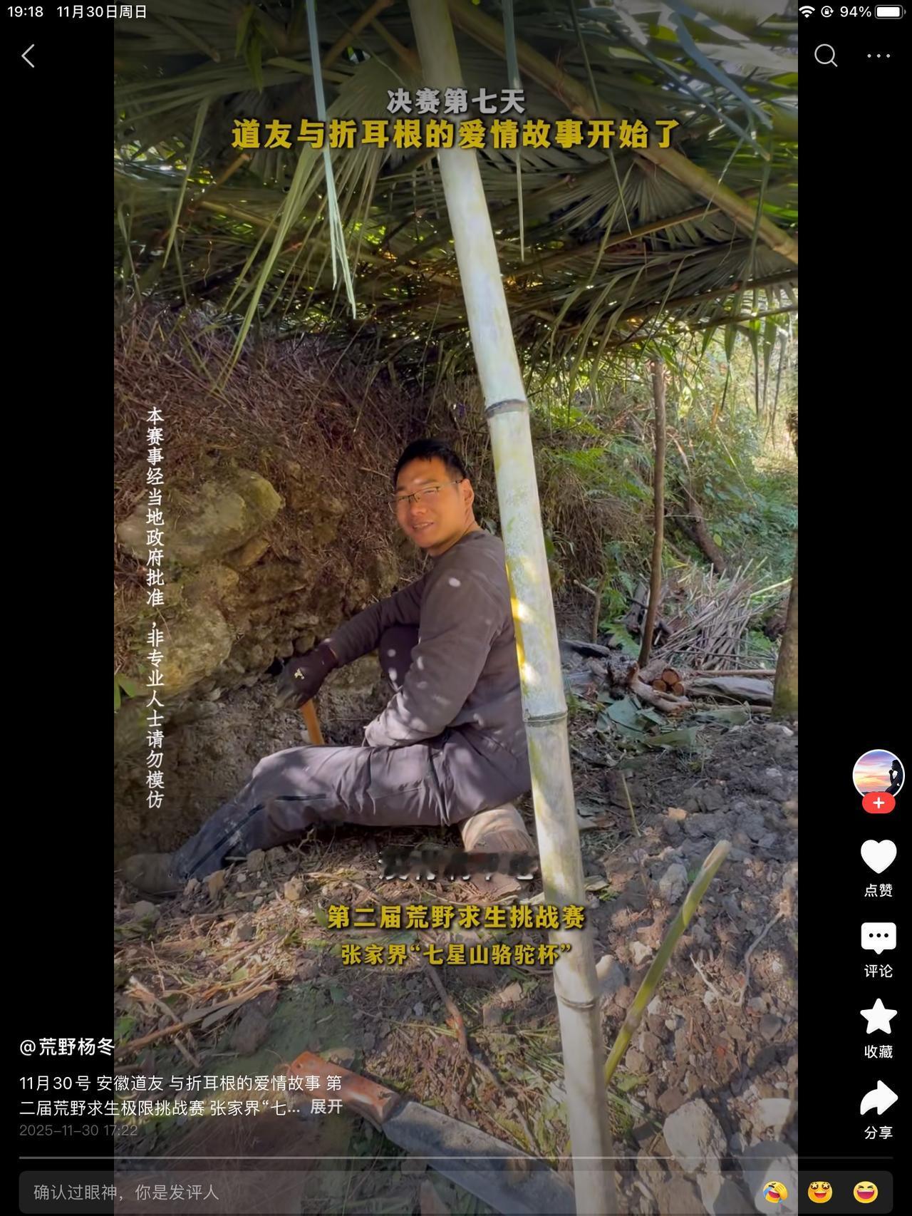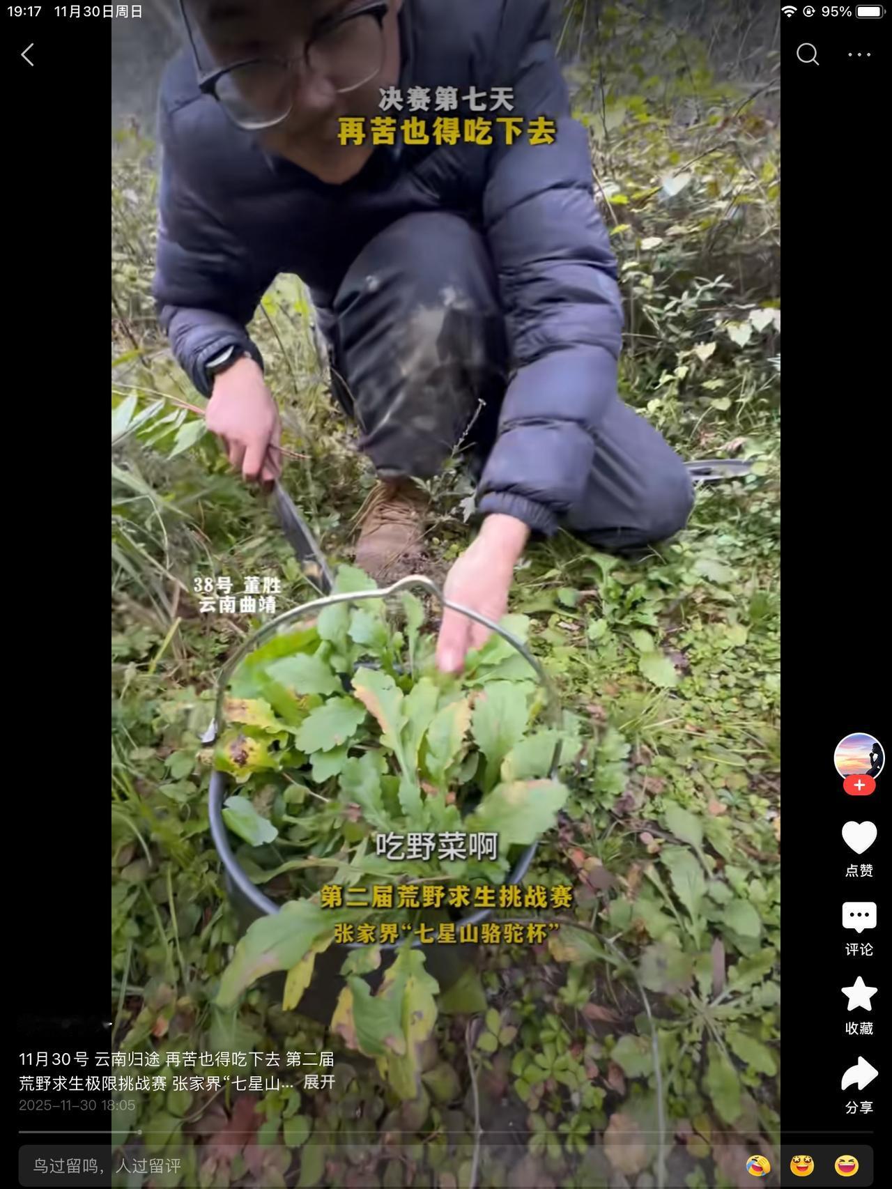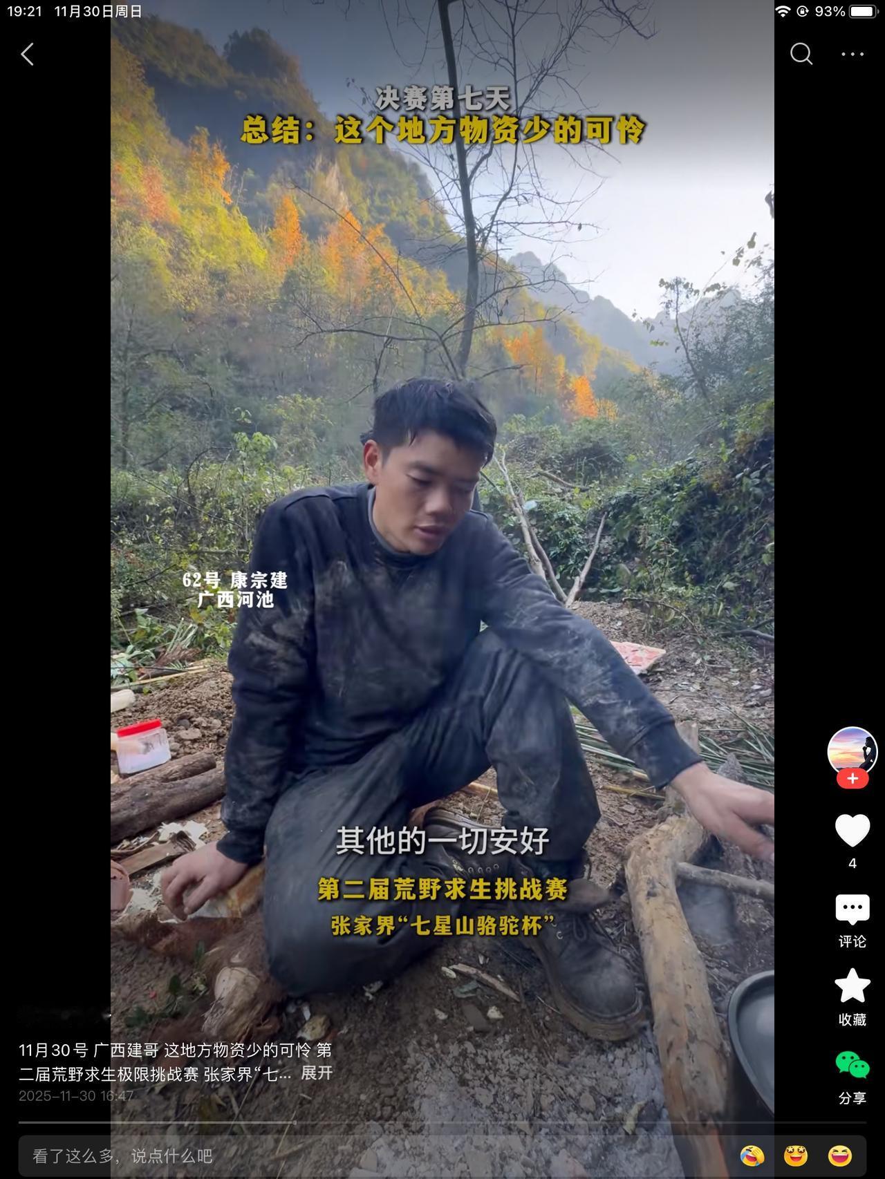 建弟住上院了!肚子疼了一晚上,思前想后还是退赛了!看来还是不舒服。这就对了,荒野求生,不求病。有病了就赶紧下山。都有老有小的。身体才是第一位的。已经很棒了。坚持十天,也不过是两千块钱的事。 扛不久就没必要坚持了。建哥是第一个舔包的。拿着棍子回家了,很开心。让你吃好喝好。没遗憾。都有状况。还有至今没生到🔥的,没物资,大家都吃草,有一个弄到丰巢了。林北看到山药没有工具,回家拿,回来发现被苗王捷足先登了。很有意思。
