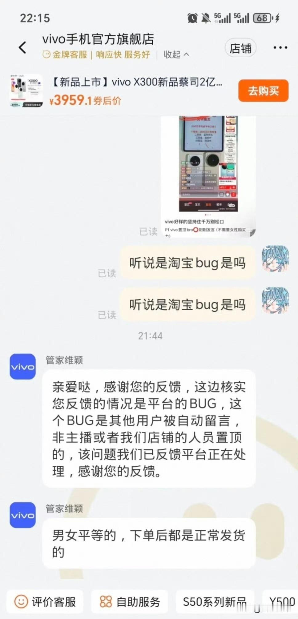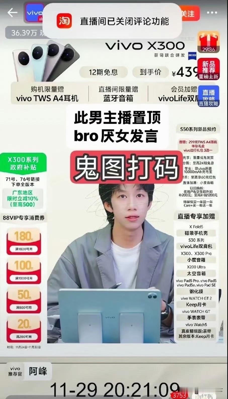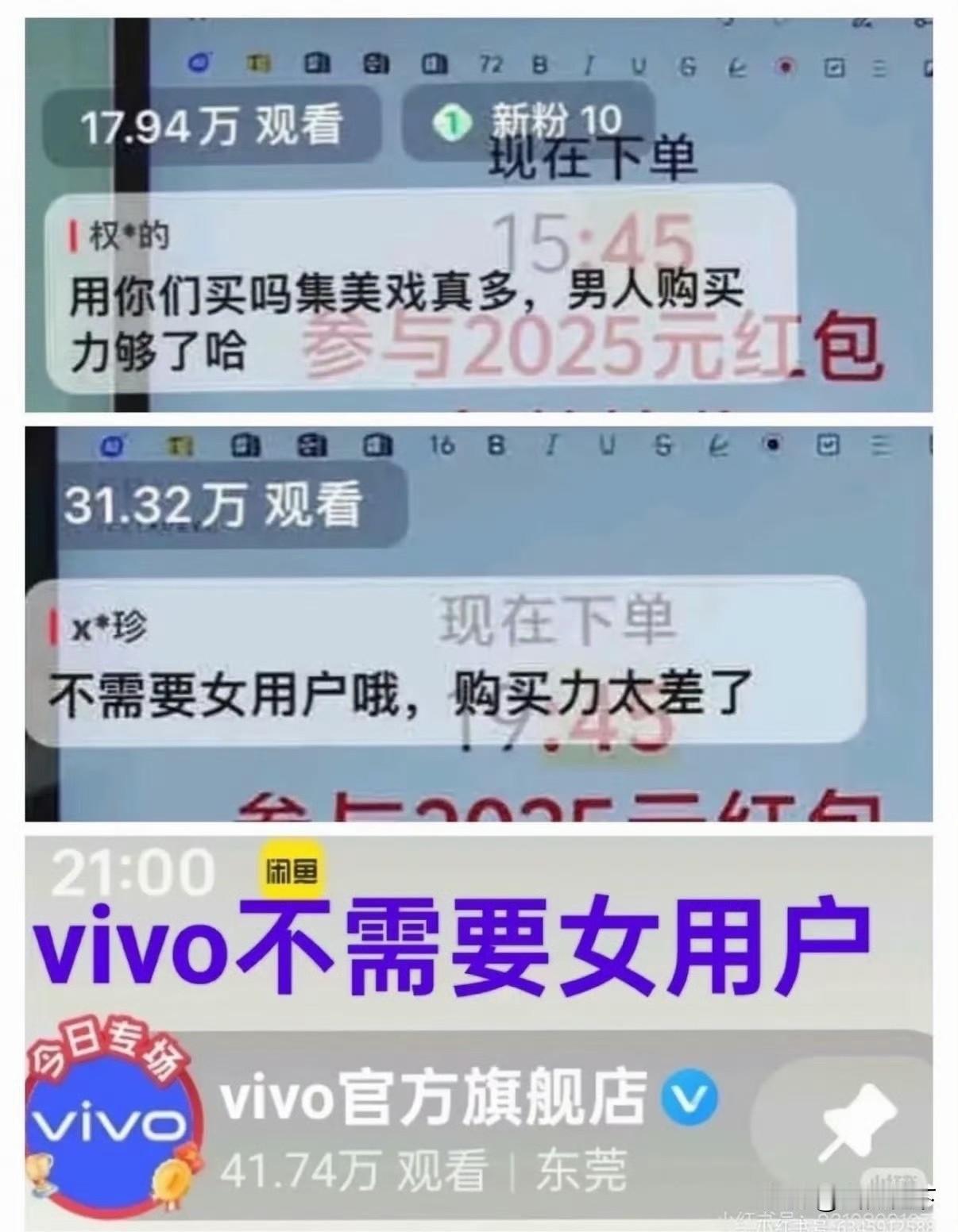 vivo你这是瓢了,近日,有不少网友反映,vivo直播间内将“用你们买吗集美戏真多,男人购买力够了哈”“不需要女用户哦,购买力太差”等评论置顶,随后引发大批用户不满。 vivo你是不是忘了,你之前就是靠女性起家的,怎么这么快就忘本了,还想甩锅给淘宝说是平台bug,谁知道人家淘宝不认,表示没有这种bug,笑死了,虽然事后vivo也道歉了,但是网友根本不买账啊[笑哭][笑哭]