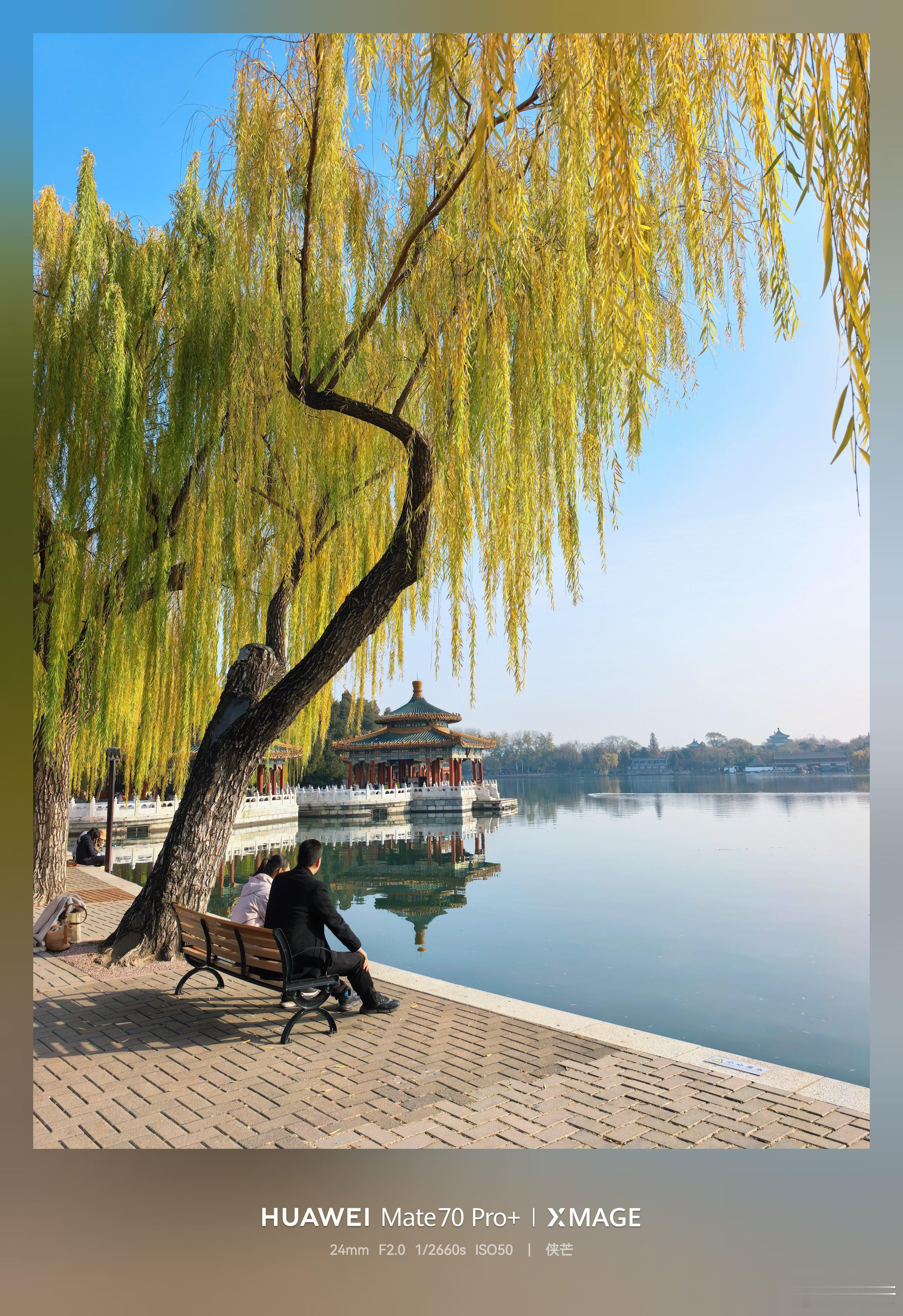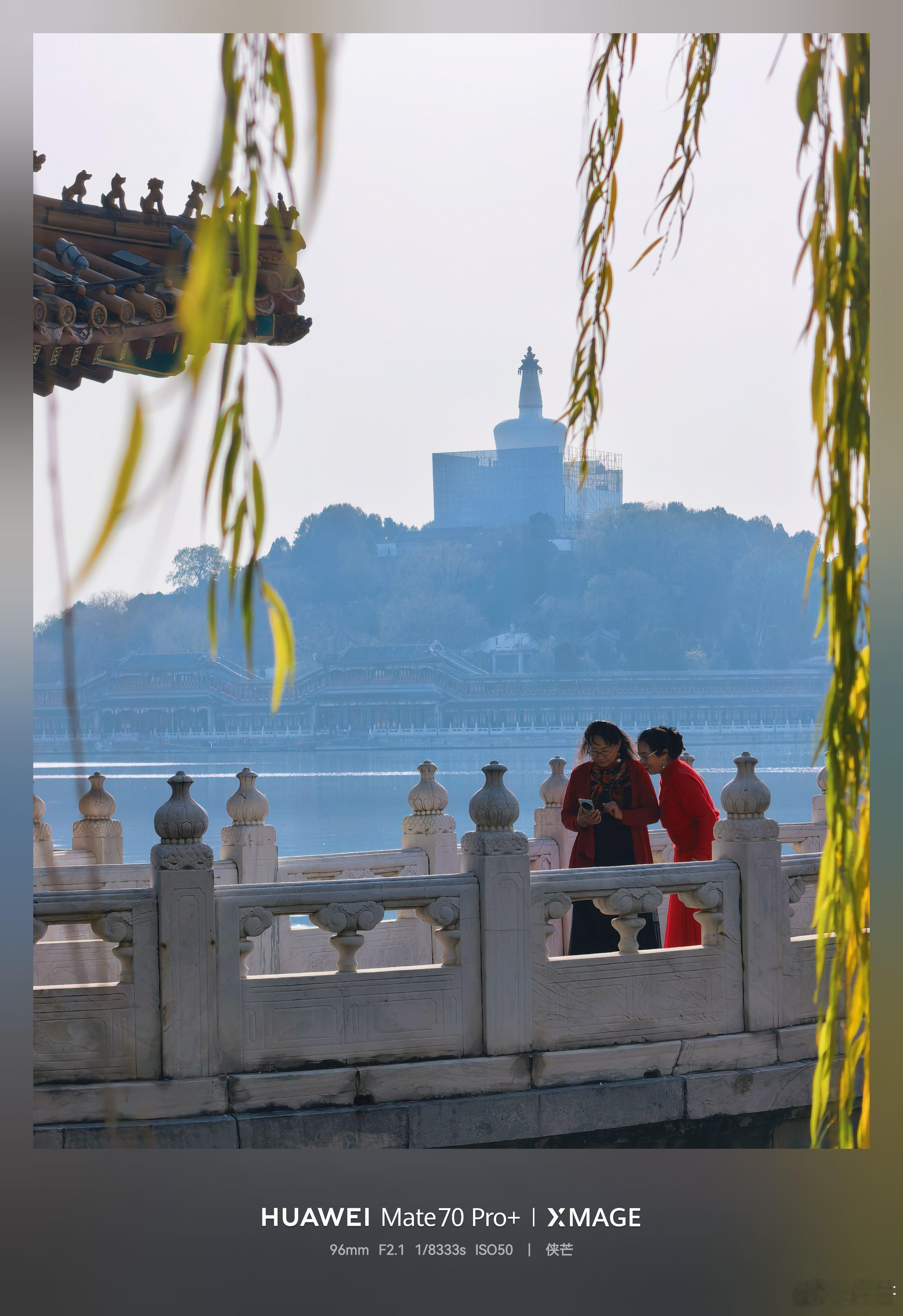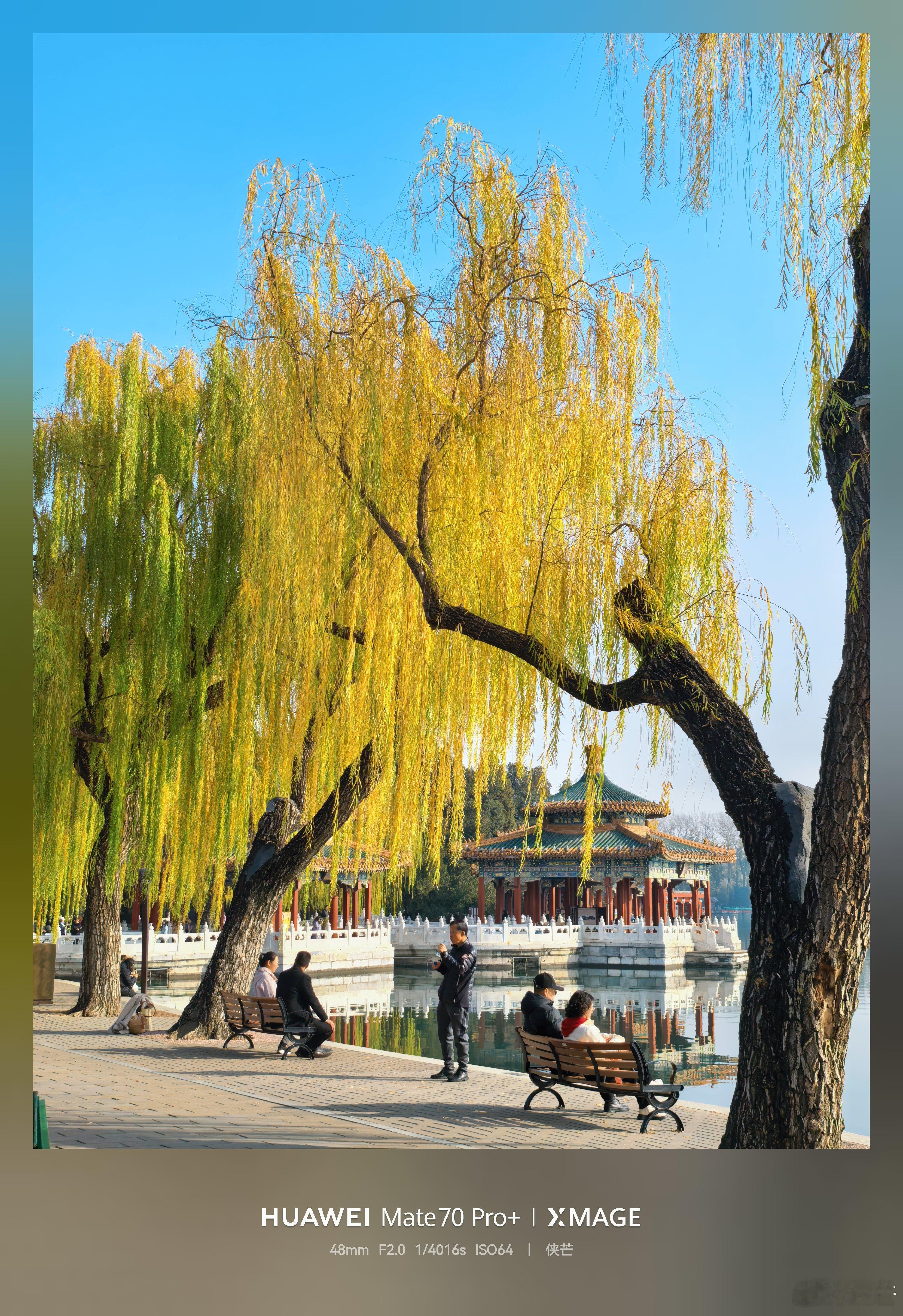 冬日北海公园 黄叶垂落,檐角鎏金, 湖心亭台倒映清波里。 石阶上人影流连, 手机框住北国秋深。摄影