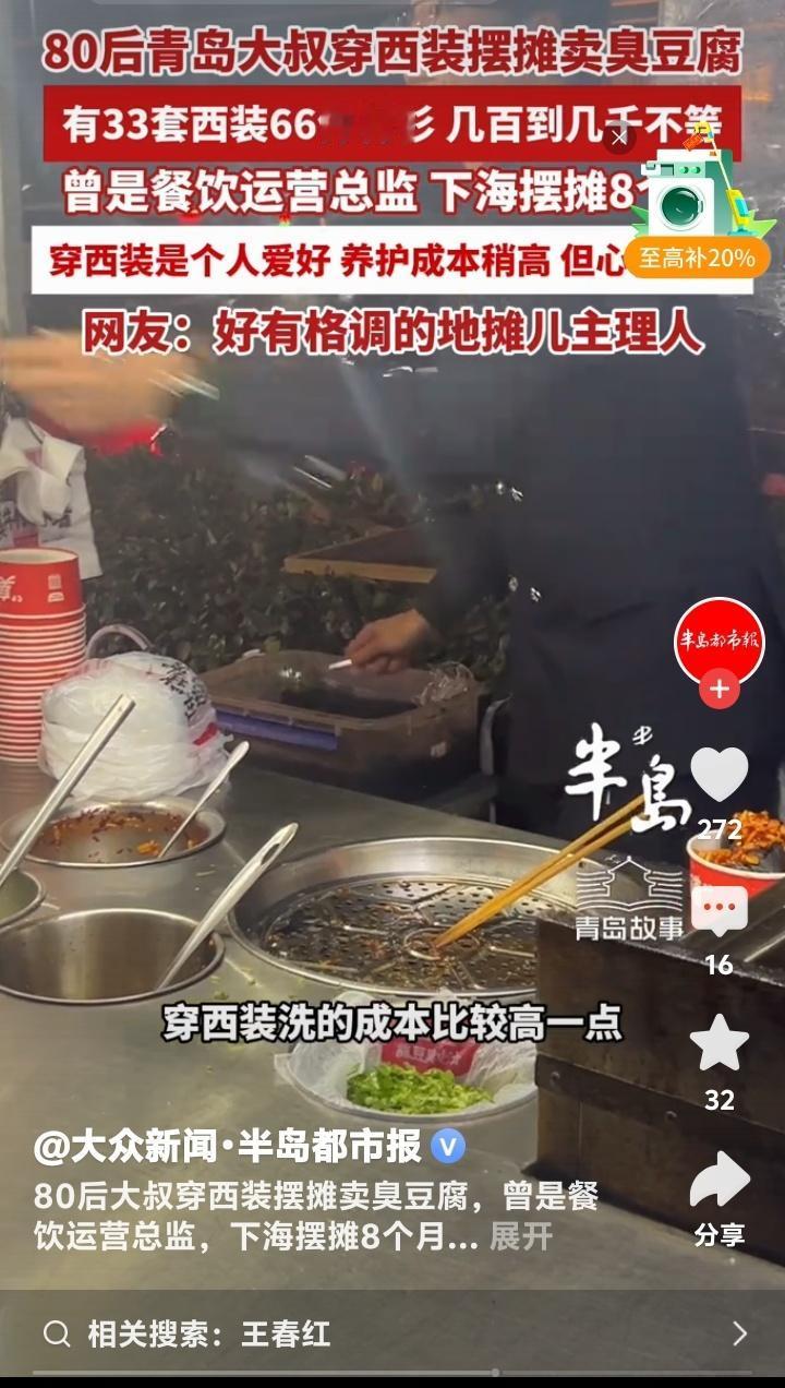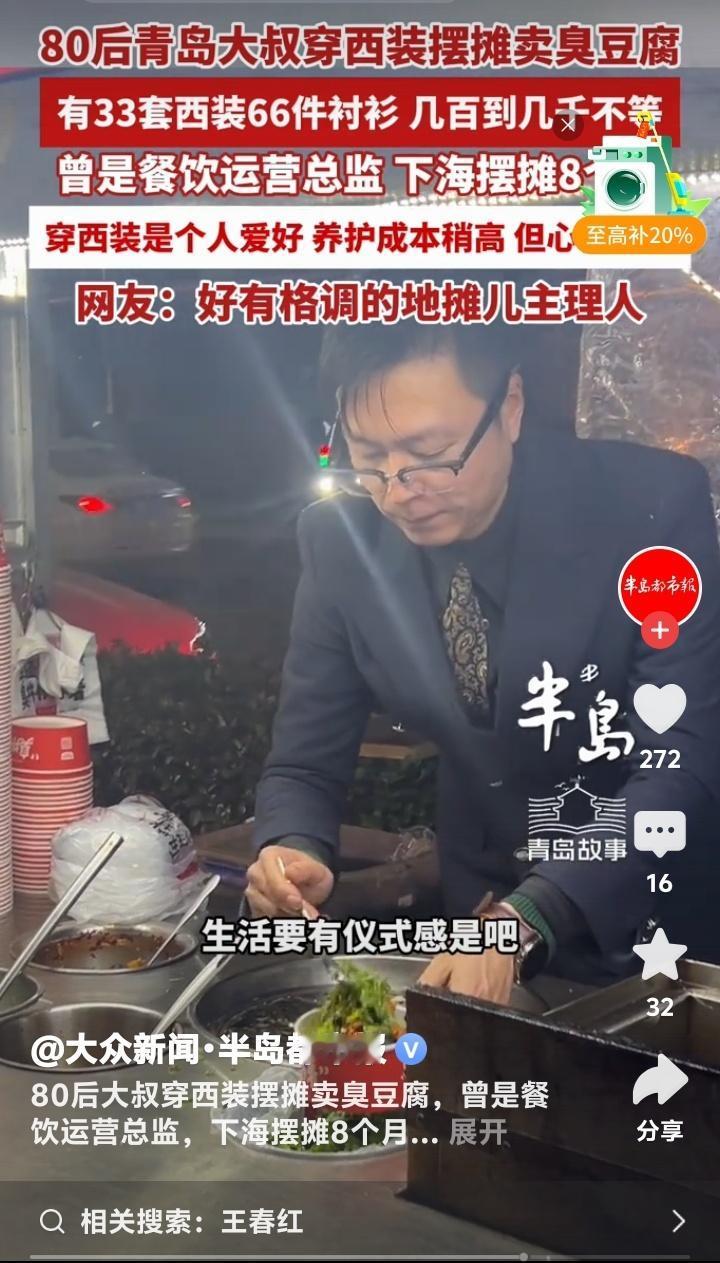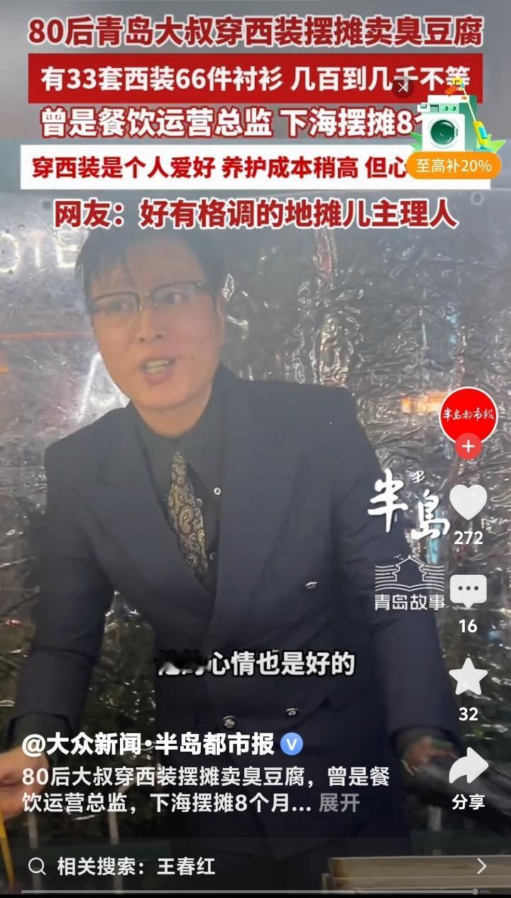 青岛台东夜市惊现西装绅士臭豆腐摊主!33套西装轮换的餐饮总监用8个月诠释什么叫生活仪式感 (来源:半岛都市报) 夜幕初垂,青岛台东步行街飘起阵阵异香。人群在某个摊位前围成圆弧,暖黄灯光下,穿着格纹三件套西装的男人正用镊子给臭豆腐插竹签。油渍溅不到他熨烫平整的袖口,烟火气染不黑他擦得锃亮的皮鞋。这位被网友称为“夜市绅士”的洛先生,曾在五星酒店宴会厅运筹帷幄,如今在烟火缭绕中重新定义奋斗的模样。 曾经的餐饮运营总监如今系着围裙调酱料。黑色西装襟前别着银色胸针,他记得每位熟客的辣度偏好:“中辣多蒜汁?今天豆腐炸得特别酥。”不锈钢餐车擦得能照见人影,调料瓶按高矮列队,这种近乎偏执的整洁,是他与生活达成的默契。 更衣室里挂着33套西装66件衬衫。从青果领礼服到双排扣商务装,每件都配好袖扣和领针。干洗店会员卡积满星星,他说:“养护成本抵半月房租,但穿上西装就像披上铠甲。”邻摊大姐笑他摆摊像走秀,他正正领带:“人要活得像个样子。” 转型源于某个加班的凌晨。看着办公楼窗外熄灭的灯火,他忽然渴望能触摸真实的温度。辞呈交得干脆,八个月前首次推餐车时,西装革履的造型让城管都愣住:“您这身……是来体验生活?”他递上名片:“以后请多关照,我是6号摊主。” 仪式感成了最佳营销。年轻白领专程带同事围观“西装豆腐男”,阿姨们举手机拍他切葱丝的优雅姿势。有姑娘坦言:“本来不吃臭豆腐,但看他用戴表的手找零钱,莫名想照顾生意。”这种跨界魅力,让月营业额轻松突破五位数。 当然遇到过不解。老同学见他系着爱马仕丝巾颠炒勺,唏嘘“沦落风尘”。他舀起一勺辣椒酱笑笑:“以前给老板写汇报,现在给生活写情书。”最温暖的认可来自穿校服的女孩,她攥着零钱说:“叔叔,你让我知道体面与干什么无关。” 国家创业补贴到账时,他刚烫好明天要穿的藏蓝条纹西装。这笔钱化作定制餐车上的雨棚雕花,变成免费提供给环卫工人的暖饮基金。他说:“政策托举着微光,我们该把光折射给更多人。” 某日暴雨骤至,摊贩们狼狈收摊。却见他不慌不忙撑开巨伞,从餐车底层取出红酒杯,斟上带给妻子的红酒。雨帘中从容切着卤豆干,仿佛身处米其林后厨。这份把苟且活成诗意的本事,恰是当代人最稀缺的修行。 如今“西装豆腐”已成夜市地标。有程序员带着烦恼来找他:“如何能像您这样不在乎眼光?”他夹起金黄豆腐浸入酱汁:“不是不在乎,是太在乎自己内心的秩序。”擦擦手补充道:“你看这臭豆腐,闻着呛吃着香——活着本就是打破偏见的过程。” 霓虹照亮他肩头的温润光泽。66件衬衫轮换的不只是衣着,是33种不向粗糙妥协的态度。当越来越多人穿着旗袍汉服来买豆腐,当整条街开始注重摊位的整洁度,他悄悄弯起眼角:“仪式感会传染。” 收摊时总见他将工具擦三遍,哼着歌给西装刷灰。有人问是否打算开连锁,他摇头:“就想让每个夜归人记住,生活再难也有人认真对待。”最后一片星光落在他别着茉莉花的衣领,那香气混着臭豆腐的浓烈,飘成城市上空温柔的月亮。 生活仪式感 跨界奋斗 职场转型 青岛身边事 青岛生活