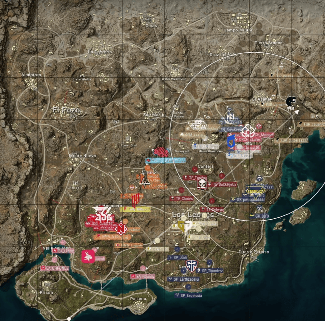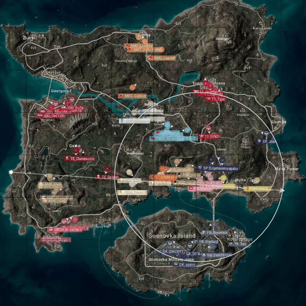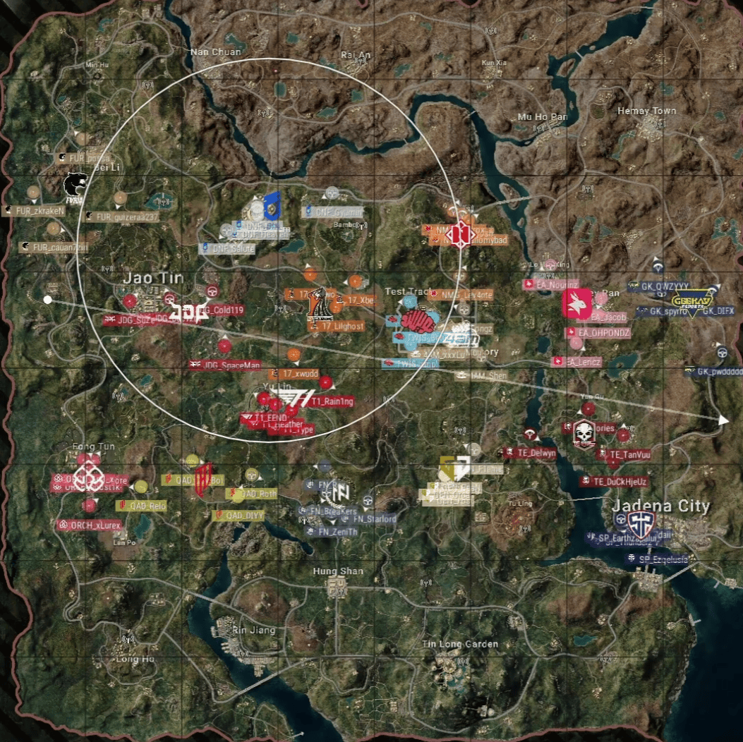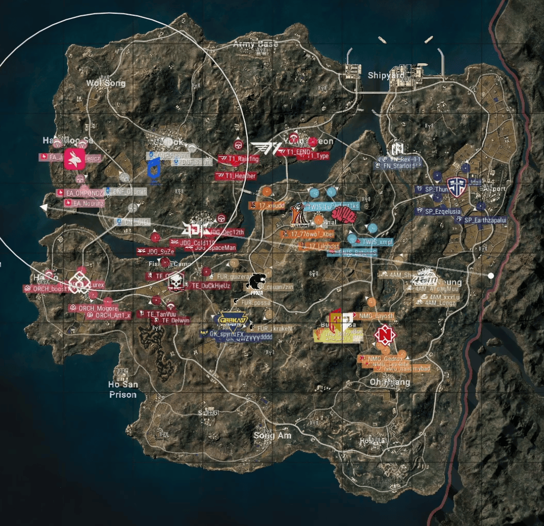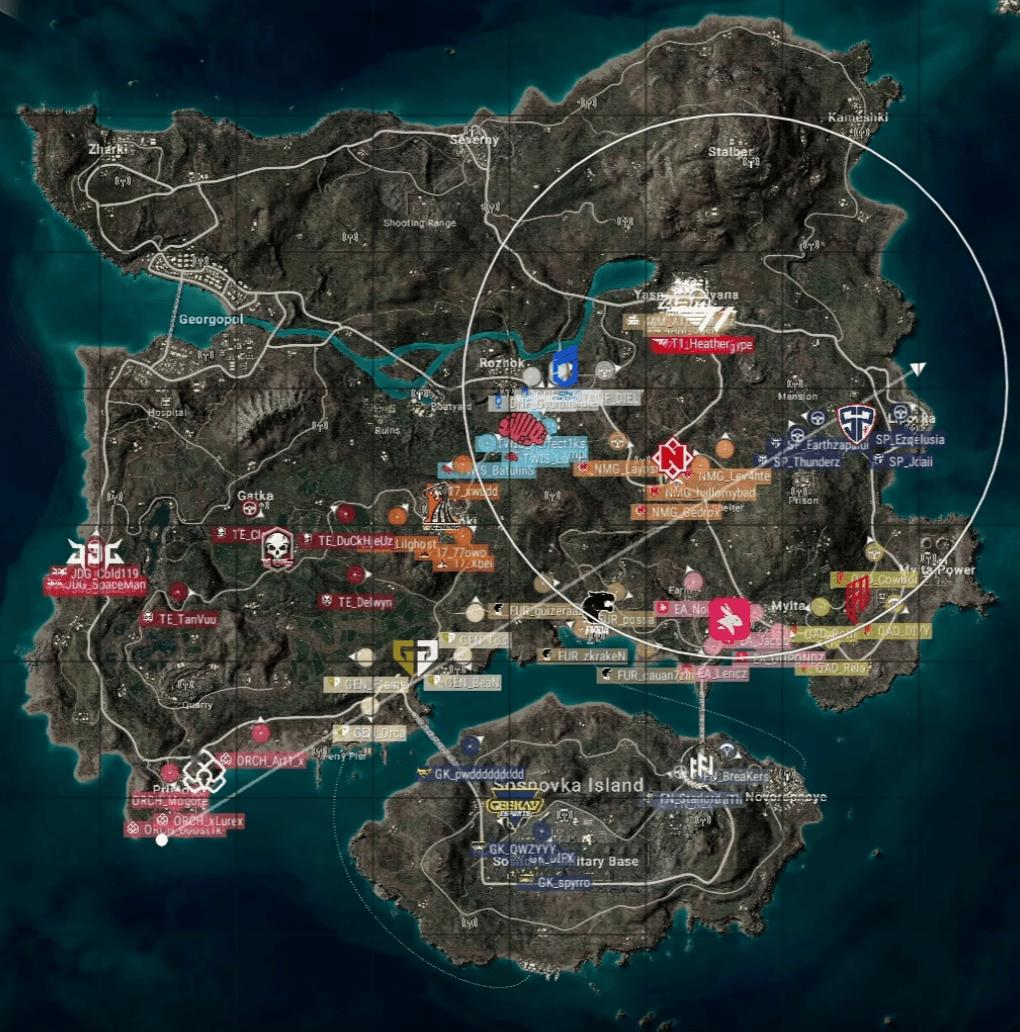梅花桩,17进圈过程中多次被T1放倒人,随后EA一名队员看到信息主动向17出击但被接住,随后T1四人围攻17所在房区,将17团灭,EA独狼蓝圈外淘汰,T1完成吃鸡。
