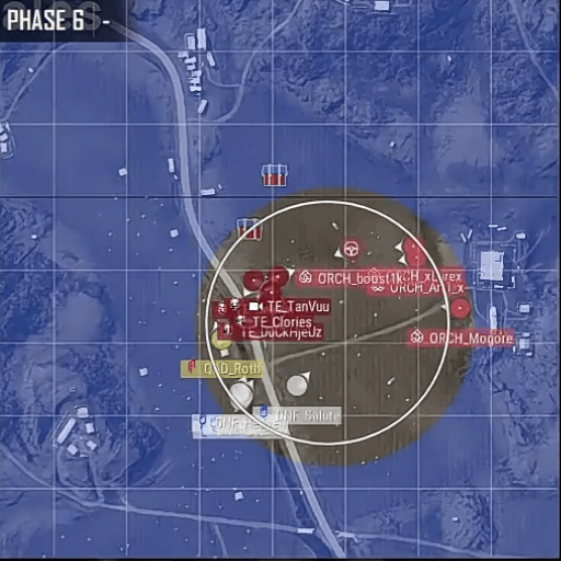阶段8,TE4V4ORCH,后者占据地形优势,TanVuu再度98K打倒ORCH一人,与此同时侧翼的clories也打掉一人后被放倒,3V2,TE前点突破与对手完成1换1,最终剩余2人完成吃鸡。