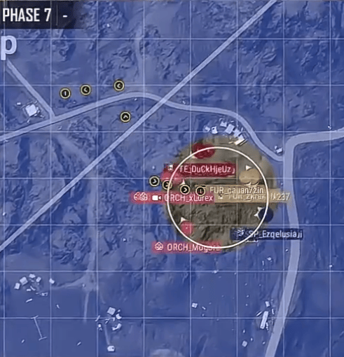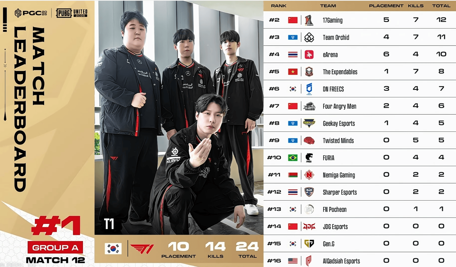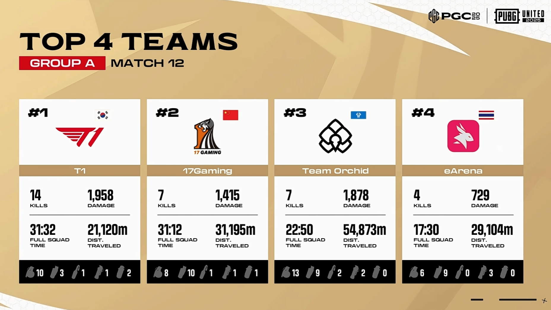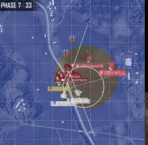 阶段8剩余6队,T1占据圈中心房区,4AM进圈先被淘汰,DNF被T1淘汰,ORCH独狼被T1淘汰。