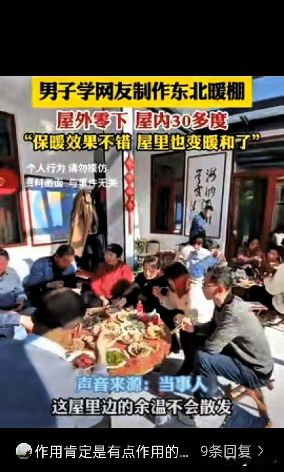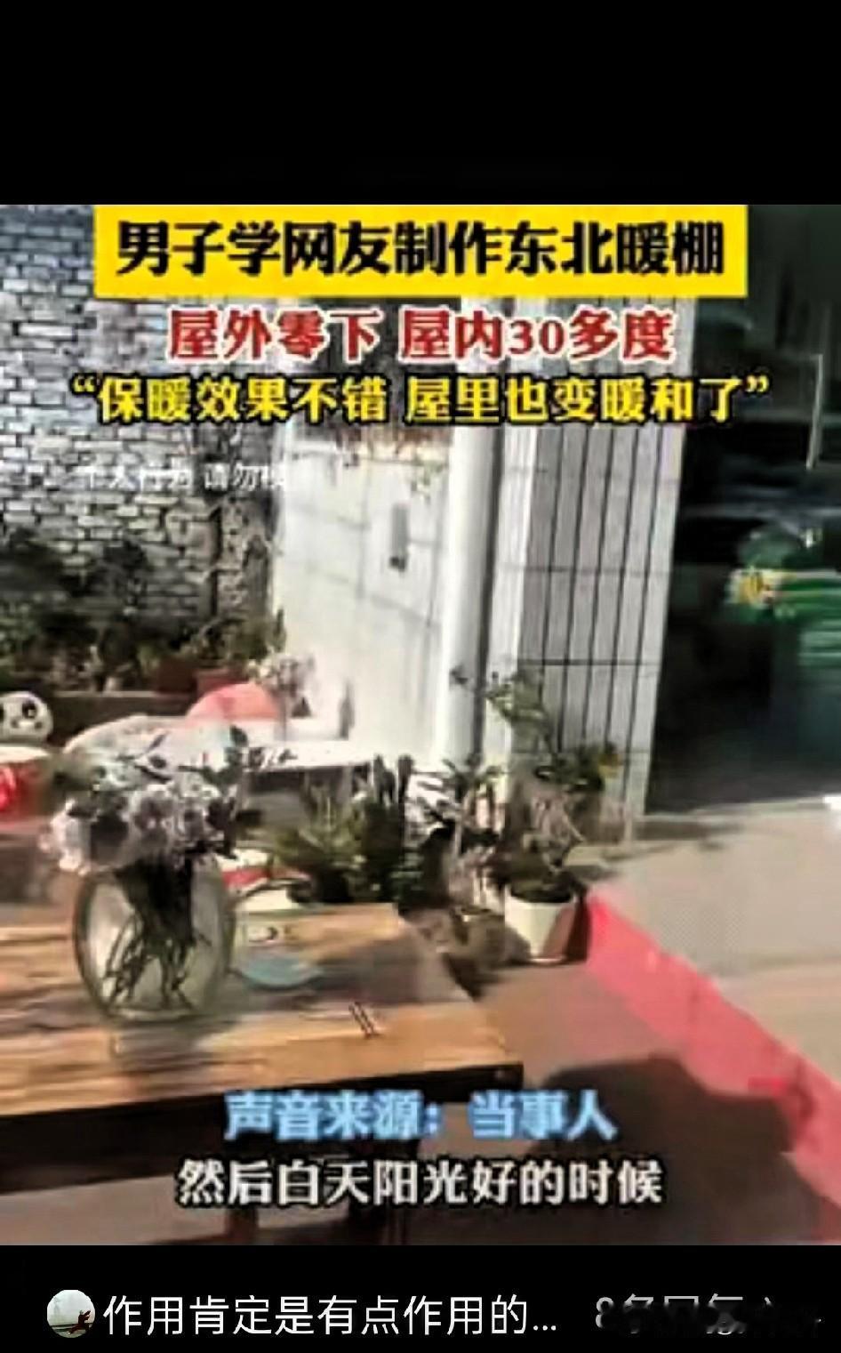 “太有头脑了”!河北石家庄,男子为了省钱应对零下天气,竟然花1000多,学网友制作东北暖棚,就让家里暖得像春天,连邻居都追着要搭建教程 入冬后石家庄冷得直跺脚,家里老人年纪大了怕冷,却死活不肯开空调,嘴里总念叨“费电又心疼”,烧煤气又担心不安全。 换别人可能早就和老人吵起来了,觉得老人“固执”,但这大哥没急着说服,反而刷到东北暖棚的视频后,直接动手照搬。 一开始邻居们都笑话他“瞎花钱”,觉得这玩意儿根本不管用,结果搭好后全被狠狠打脸:南向的暖棚刚好裹住整面墙,白天晒太阳时棚内温度直接飙到38℃,里屋都能暖到22℃,老人穿件薄外套就够了; 到了晚上,在棚外盖层旧棉被保温,清晨起来棚内还有17、8℃,电热毯直接被老人“下岗”,笑得合不拢嘴。 这1000块花得简直太值了!后续就算塑料布坏了,换一块才几十块,比起每月几百上千的电费,简直是“一本万利”。关键是大哥既解决了老人怕冷的问题,又尊重了老人节俭的习惯,这份孝心和智慧真的太让人佩服! 其实生活里的很多难题,从来不是“改变别人”,而是“想办法适应”。这大哥用行动证明,比起抱怨和争执,静下心来想办法,才是最解决问题的方式