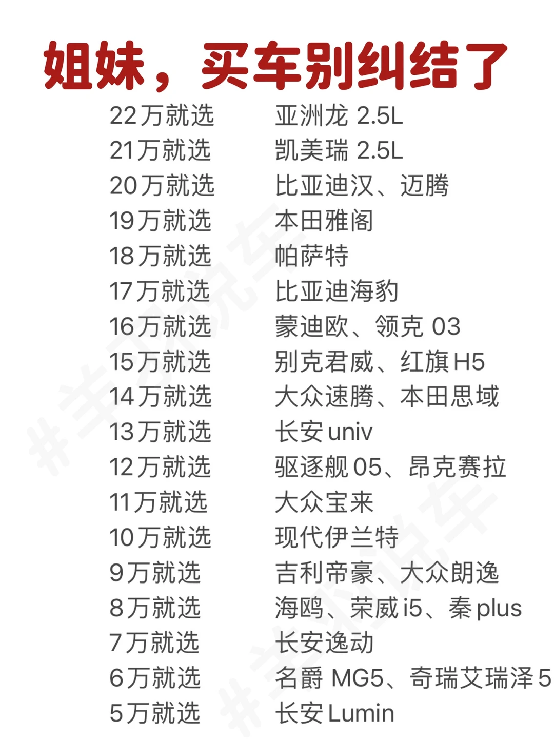 👭姐妹,买车别纠结了,你想要的轿车车型都在这里了,照着选错不了的! 🚗买车是件比较简单的事情,不要想的那么复杂,很多女生买车纠结,不知道怎么选?其实按照大家的选择基本不会错的,群众的眼睛是雪亮的! 尤其是有选择困难症的姐妹,要仔细看看!
