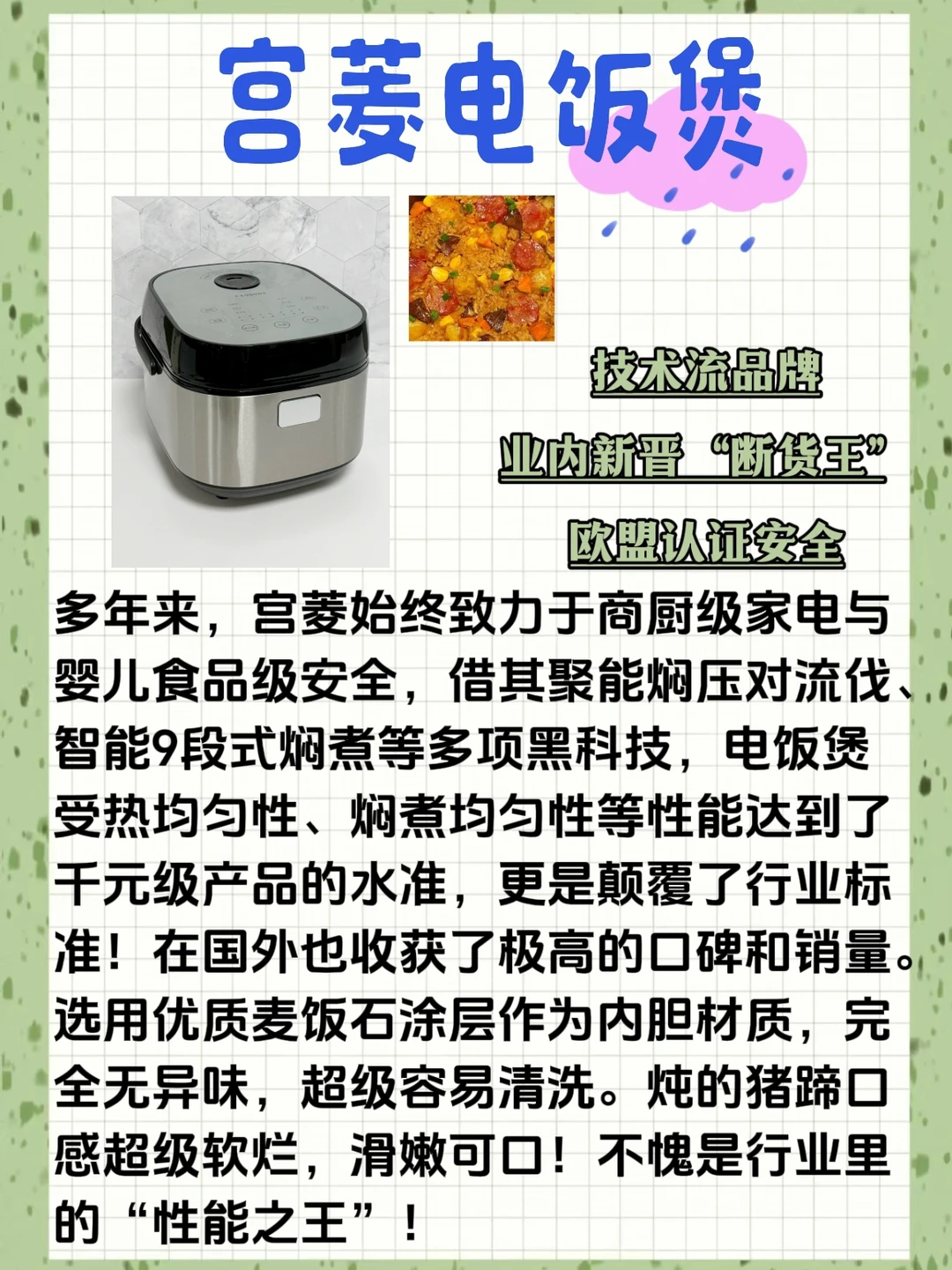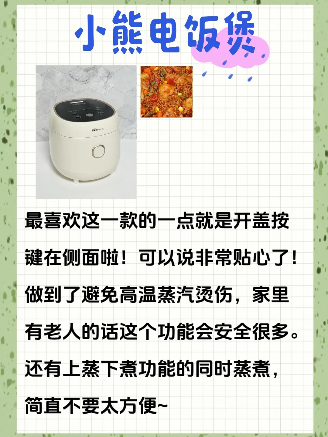 🏖🏖姐妺们真的别再跟风买电饭煲了 一定要先做好电饭煲测评和电饭煲推荐功课再入哦 今天推荐大家几个不错的电饭煲测评🧏🏻♀️🧏🏻♀️ 码住慢慢选择好用的电饭煲~ 😉电饭煲推荐——宫菱电饭煲:业内新晋“断货王” 😉电饭煲推荐——美的电饭煲:智能操控 😉电饭煲推荐——苏泊尔电饭煲:自定义菜单 😉电饭煲推荐——小熊电饭煲:上蒸下煮