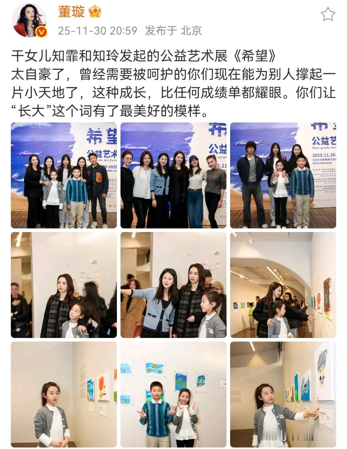 11月30日,董璇发文为干女儿佟知霏和佟知玲发起的公益艺术展《希望》打call。 佟知霏和佟知玲是关悦、佟大为的女儿,而董璇和关悦是闺蜜。 董璇是带着女儿小酒窝一起去看艺术展的,两人还和关悦一家五口拍了合照,两家人关系真好。 从合照中可以看出,关悦的3个孩子共用一张脸,女儿和儿子都像爸爸佟大为。佟大为肤色太黑了,好久都没有看到他出来演戏了。 佟大为小儿子和小酒窝合拍了一张,两位小朋友都用了一个拍照手势,好可爱呀。 董璇每次过生日时,关悦都会给她庆祝生日,有这样的朋友真好。 对此,你怎么看呢?