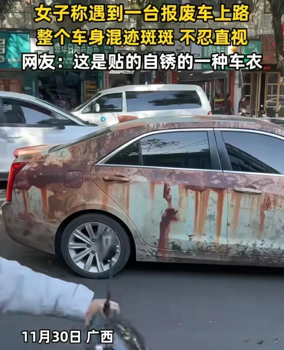 这不是报废车?只是贴了自锈的车衣? 果然是贫穷限制了我的想象! 巴黎世家的审美观就是与众不同! 仔细看车窗的玻璃,车胎都是崭新的。 转念一想,这是打扮好处多多! 不仅能怒省十年洗车费,而且一般车也不敢靠近它。更重要的是,没人会跟你借车! 萝卜青菜,各有所爱,只要合规就好!