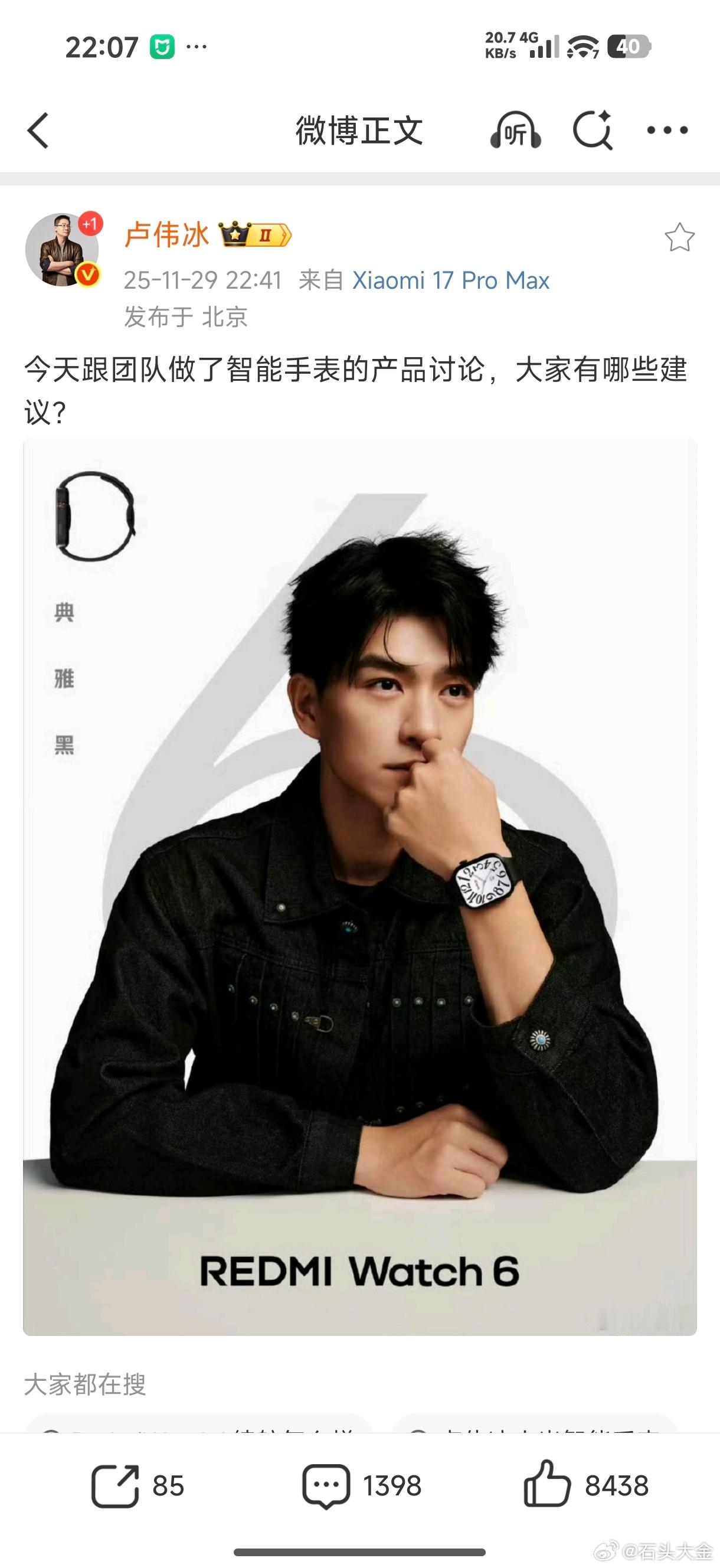 卢总调研小米智能手表,小米高端智能手表稳了,至于建议,跟S1一样做的全面一些,首先无线充电一定要有,千万不要搞触点充电,因为出门带充电器不方便,而无线充的可以用手机上的无线反冲…再一个就是质感,功能顶级配置就行了,系统更新跟上即可…