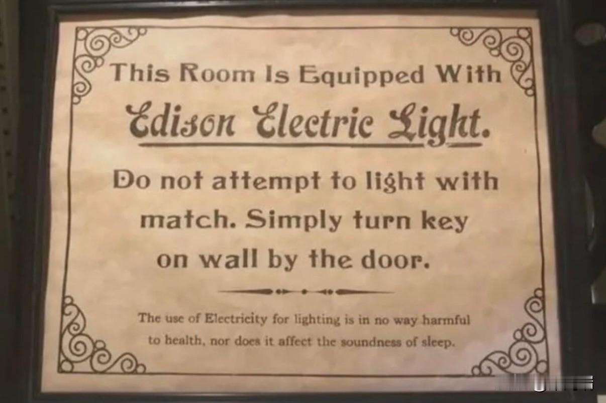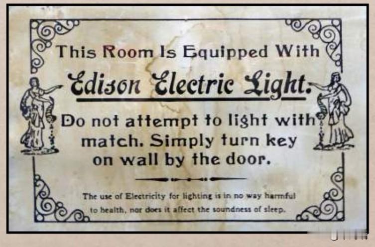 这是美国爱迪生电灯公司 (Edison Electric Light) 在 19 世纪末至 20 世纪初使用的历史性告示牌,旨在帮助人们从煤气灯过渡到电灯。 标志详情 当电灯首次推出并安装在酒店和火车站等公共场所时,许多人对这种新技术感到陌生,甚至恐惧。这个标志旨在解释如何安全操作电灯,并消除人们的顾虑。 标志指示用户“不要尝试用火柴点亮”,而是“简单地转动门边墙上的钥匙”来操作灯具,因为早期的电灯通常使用旋转式钥匙开关。有一位老太太曾经讲过一件很有趣的事情,她说她家是镇上第一户通电的。他们一家人都不懂电是怎么用的,她记得她父亲认为每个插座都必须插着电器,否则电流就会漏到地板上,把大家都电死。他们还说,下雨天必须把所有电器都关掉,否则电流会招来雷击。 安全保证 标志底部向公众保证:“使用电力照明对健康无害,也不会影响睡眠质量”。