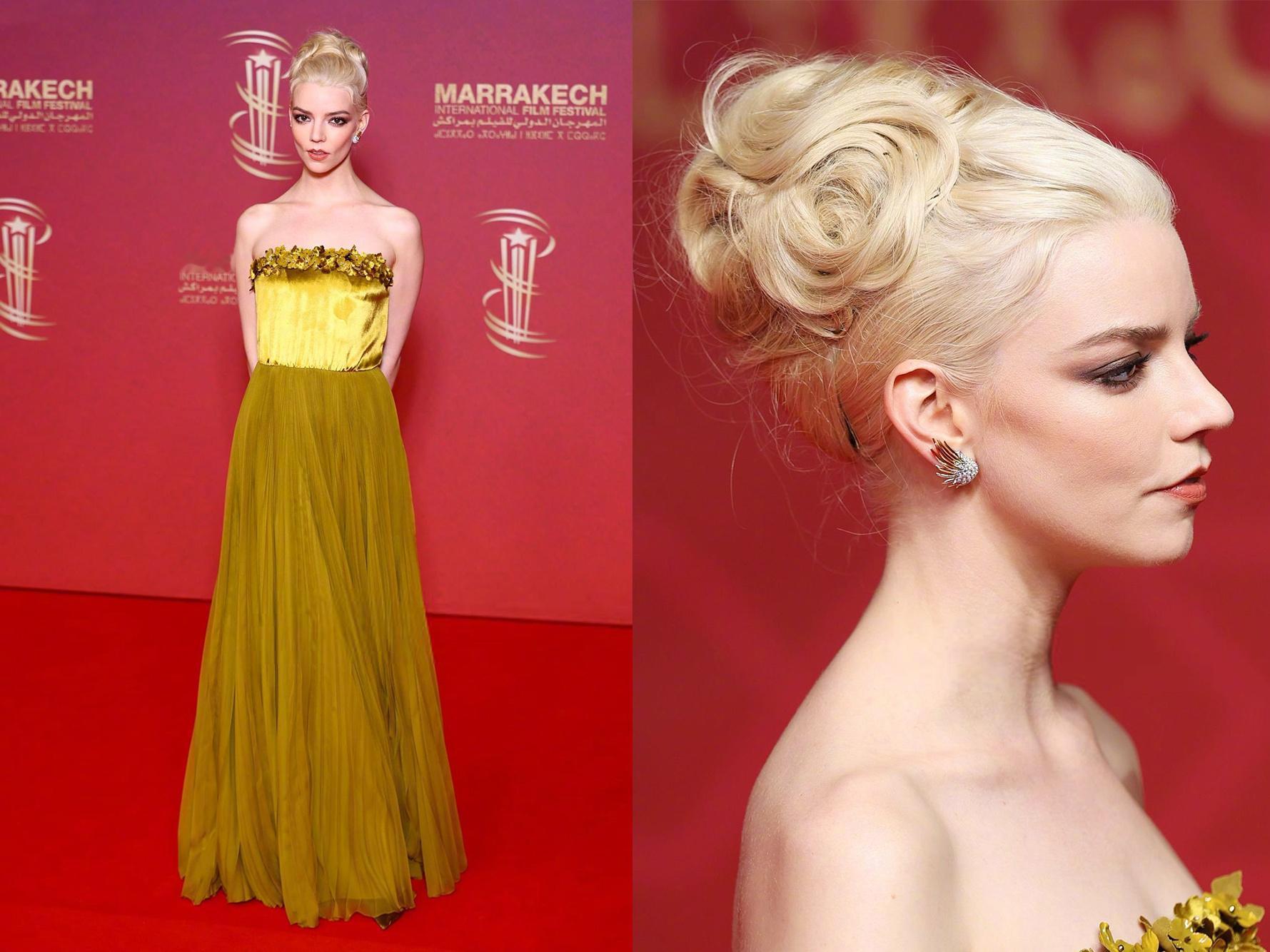 Anya Taylor-Joy 作为主竞赛单元评审,亮相摩洛哥第22届马拉喀什电影节,两套来自Jonathan Anderson为她定制打造的DIOR礼服,都搭配上Tiffany & Co. 高级珠宝,黑裙红唇配金色长发,白色铃兰花点缀,带着轻盈优雅的美;另一身金色礼裙 + 盘起的发髻,尽显复古高贵气质。