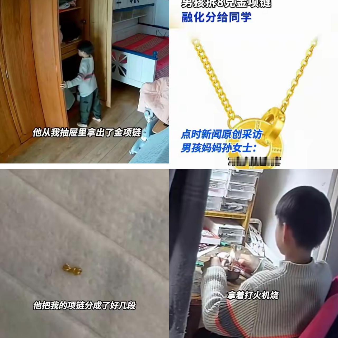 山东8岁男孩将妈妈8克金项链分成多段送给同学,孩子妈妈说儿子已经记不清分给了谁,仅找回一小段,真的太搞笑啦! 其实孩子哪懂黄金多值钱啊,在他眼里,这不过是能讨好同学、交到朋友的“小玩意儿”。 打一顿根本没用,反而会让他搞不懂“错在哪”——不是分享不对,是没分清物品的价值和归属。 现在很多孩子对“钱”没概念,更不懂物权边界,这才是关键。 家长与其事后抓狂,不如提前给孩子立规则:贵重物品不能乱乱送,再用零花钱、做家务等方式,让他慢慢明白“价值”的意义。