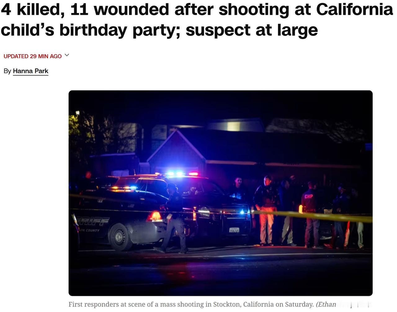 美国儿童生日聚会发生大规模枪击事件,4死11伤,枪手在逃 当地时间周六下午6点左右,加利福尼亚州斯托克顿一家宴会厅内一名儿童生日聚会发生的大规模枪击事件造成至少4人死亡,11人受伤,嫌疑枪手仍在逃。 当地警长办公室发言人希瑟·布伦特称,受害者中有儿童和成年人,遇难者年龄分别为8岁、9岁、14岁和21岁,当局尚未公布遇难者姓名。 布伦特在新闻发布会上说:“初步迹象表明,这可能是一起有针对性的事件,这是一项非常活跃且持续进行的调查,信息仍然有限。” 警长办公室称,枪击事件宴会厅与多家企业共用一个停车场,包括一家Dairy Queen,正在举办一场家庭庆祝活动,调查人员获悉这是一场有100到150人参加的幼童生日派对。嫌疑枪手逃跑了,目前仍在逃。官员们呼吁公众提供信息帮助,侦探们正努力确定可能的动机。 据枪支暴力档案馆统计,今年迄今美国至少发生了380起大规模枪击事件——定义为至少四人被枪击,不包括枪手本人。