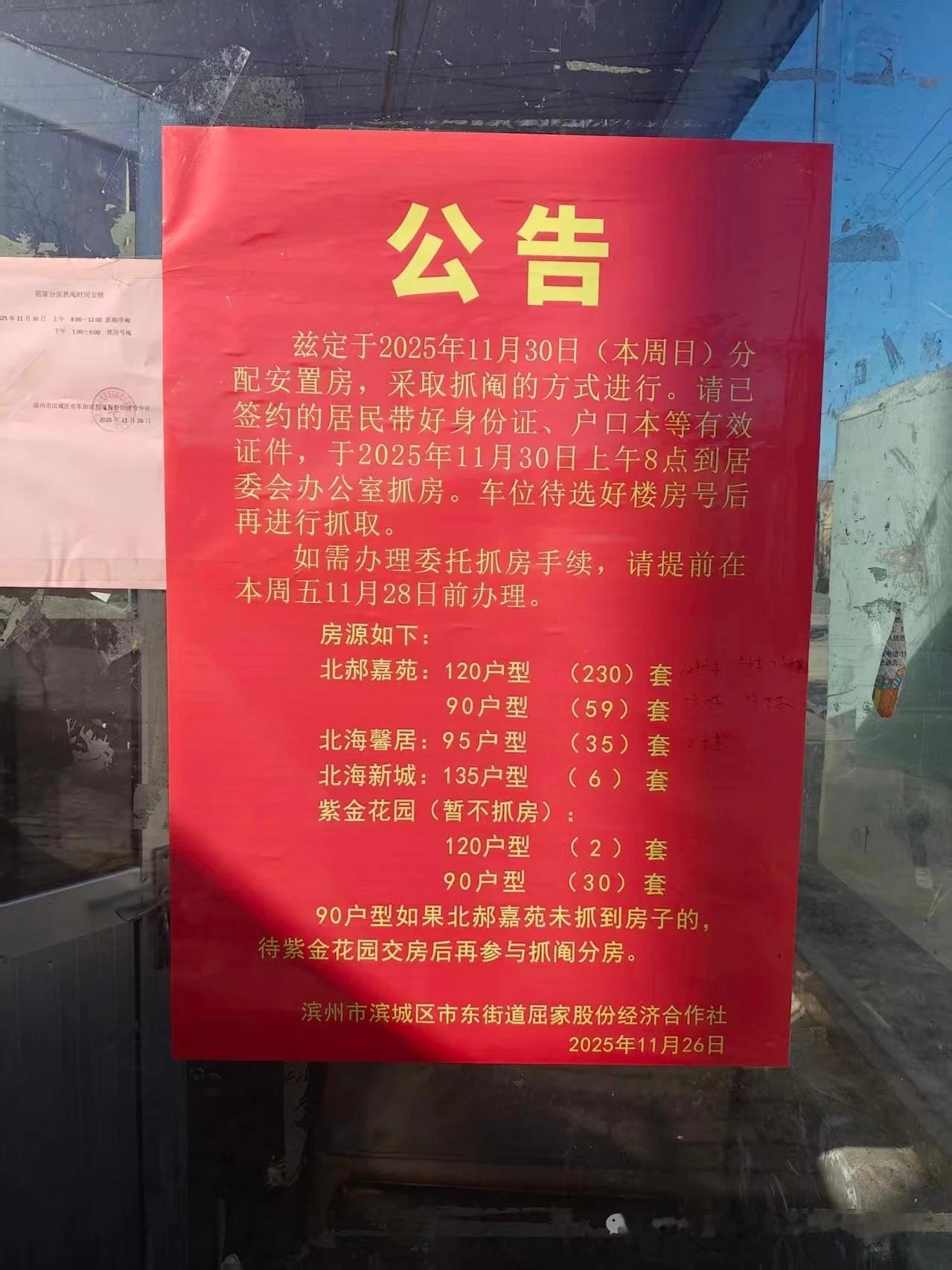 滨州一城中村开始抓阄选房 2025年11月30日,山东滨州滨城区市东街道屈家村启动搬迁安置抓阄选房,上午抽号、下午选房,部分村民分享选房经历,仍有少数村民未同意选房;此前11月26日该村已张贴公告,明确以抓阄方式分配安置房。 今年10月该村张贴改造补偿安置方案征求意见稿,搬迁范围为屈家老村盘房屋及附属物,安置于北郝嘉苑等4个高层小区,户型涵盖90-135㎡,均为现房或待交房,车位及储藏室多需自费,安置用地为国有出让土地。 屈家村与湾东赵、后刘村紧邻南侧化工厂,村委呼吁此次拆迁是解决村集体问题的重要机遇,错过则后续改造难度极大。 据地名志记载: 该村曾名前刘,明初刘氏迁此建村,清初屈氏迁入后易名,现居屈、刘两姓。 来源 看滨州