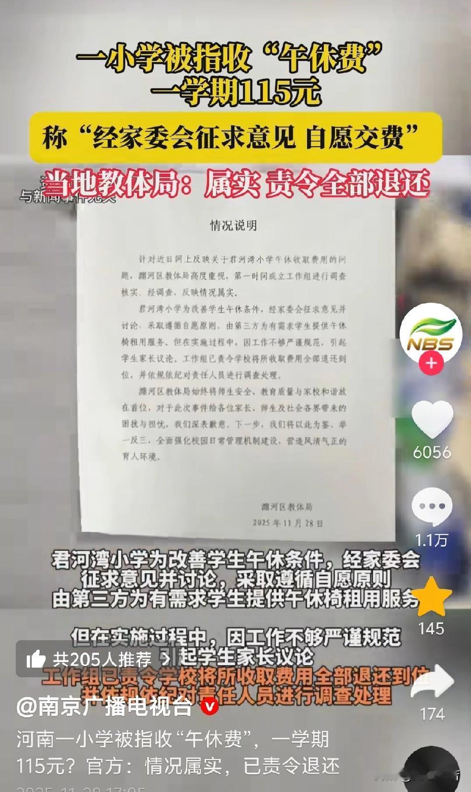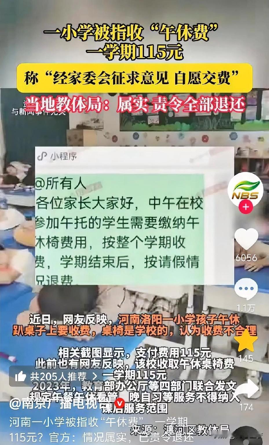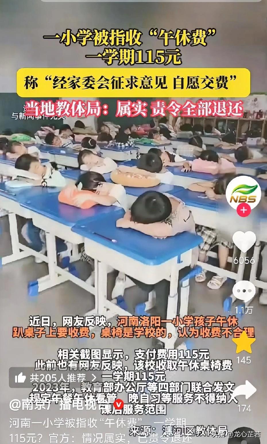小学生趴桌子上午休也要收费,这也太离谱了!(信息来源:南京广播电视台) 近日,河南洛阳的君河湾小学,给家长发了一则通知,要求每人每学期收取115元的“午休费”。 家长接到通知后表示,午休就是趴在桌子上眯一会儿,而君河湾小学作为公办学校,课桌本身就是学校的,不应该收费。 据统计,君河湾小学共有2397名学生,每人115元,合计27万余元。那么这笔钱该不该收?到底是谁收取了? 对此,当地教体局先后回应了三次。开始解释说,午休桌是第三方免费提供的,每天只收9毛钱的使用费。 问题来了,这解释与家长的说法对不上了。这第三方是把学校的课桌全部换了?还是把另外一批午休桌搬进了教室?这有点不符合逻辑 。 所以,有的家长就投诉了。教体局再次回应说,这是爱心企业的成本价设施,已经和家委会达成共识了,收费按天计算,期末再结算,家长可以自愿选择。 这话说的天衣无缝,“自愿”二字说来轻巧,可是面对学校的建议,家长敢说“不”字吗?谁不担心孩子在学校被另眼相看呢! 这事儿被发到网上,被引发讨论之后,当地教体局的态度又发生了转变,不但公开道歉,还责令学校退还所收费用,并表达要依法责任人进行调查处理。 看了视频,这事儿说白了就是学校找错了收费由头,既不合规也让家长寒了心,官方责令退费的处理还算及时,但该防着此类事件再次发生。 首先,收费本事就没道理。公办学校的桌椅本就是公家配的基础设施,学生用作午休是该有的权益,哪有额外收费的说法?午餐午休看管这种基础服务不能收费,教体局拿“家委会”同意当理由根本站不住脚,其实很多家长是没时间接送才被迫缴费,所谓的“自愿”根本不存在。 再看学校和教体局的做法,挺让人无语的。 一开始说第三方提供桌椅收使用费,后来又改口是爱心企业成本价、家委会共识,甚至还否过有这回事儿。说法变来变去,明显是收费这事本身就站不住脚,没正经依据。 最后,退费只是第一步。家长在意的不是115块钱,而是怕学校开了乱收费的头,以后再冒出各种莫名收费。 义务教育本该就是公益的,学校不该盯着家长的钱包,主管部门也得把监管做到位,分清楚责任、堵上漏洞,别让类似的事再折腾家长和孩子。(来源:南京广播电视台)