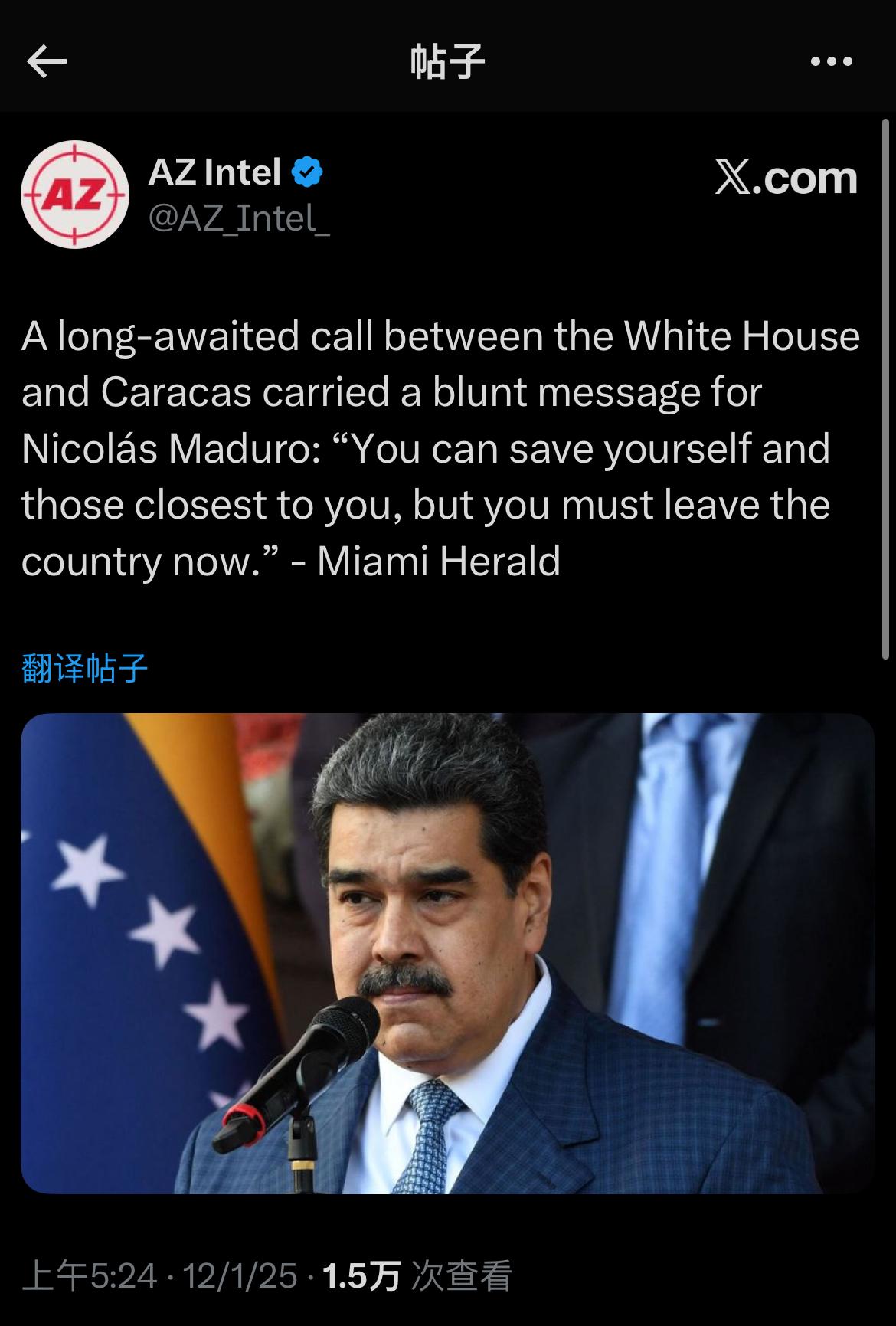 🇺🇸🇻🇪突发新闻:据报道,特朗普给了尼古拉斯·马杜罗最后一次机会,让他带着家人安全离开委内瑞拉——但前提是必须立即离开。 马杜罗提出的全球特赦和军队控制要求遭到拒绝。谈判破裂,美国目前已关闭委内瑞拉领空,并在委内瑞拉近海部署了“杰拉尔德·福特”号航空母舰和一支海军陆战队远征部队。 潜在军事行动的倒计时已经开始。 来源:《纽约邮报》