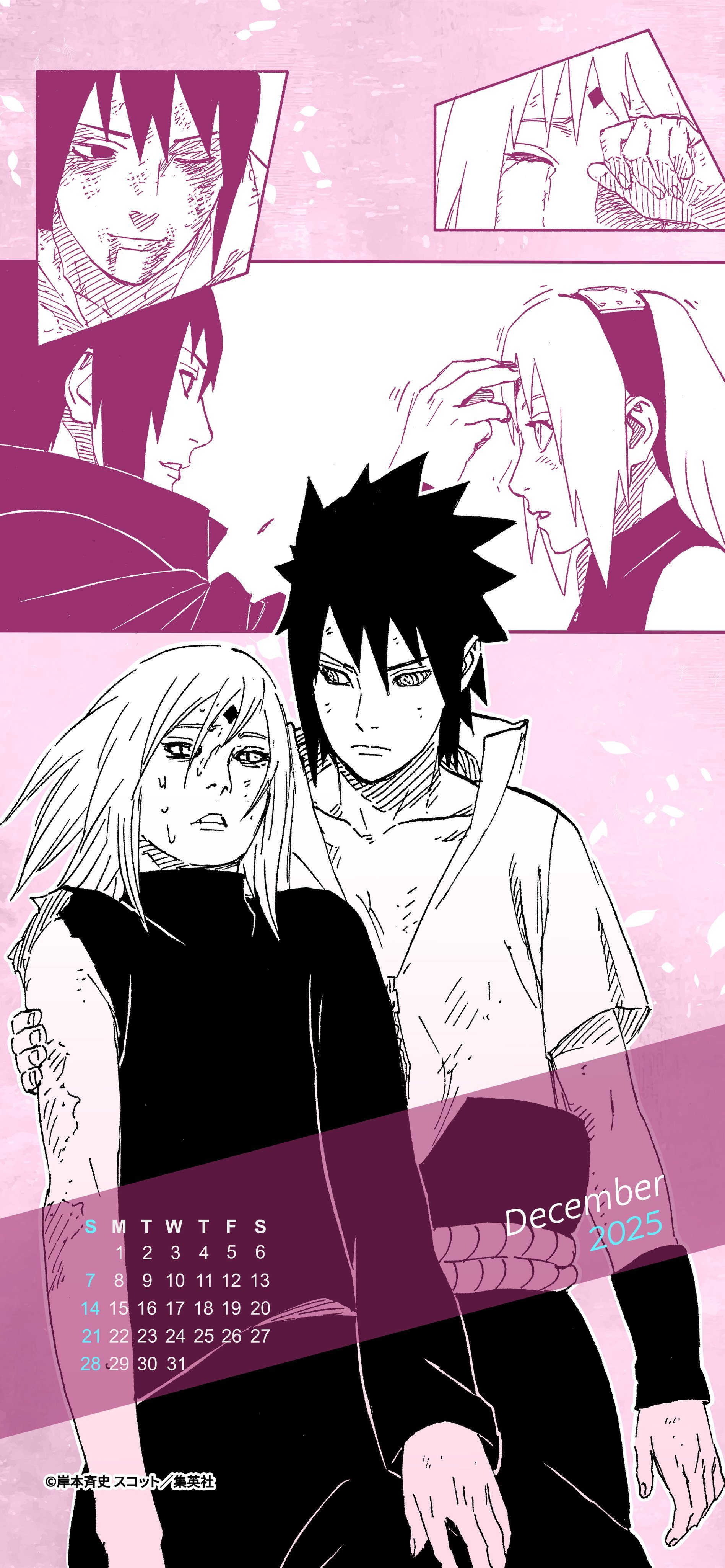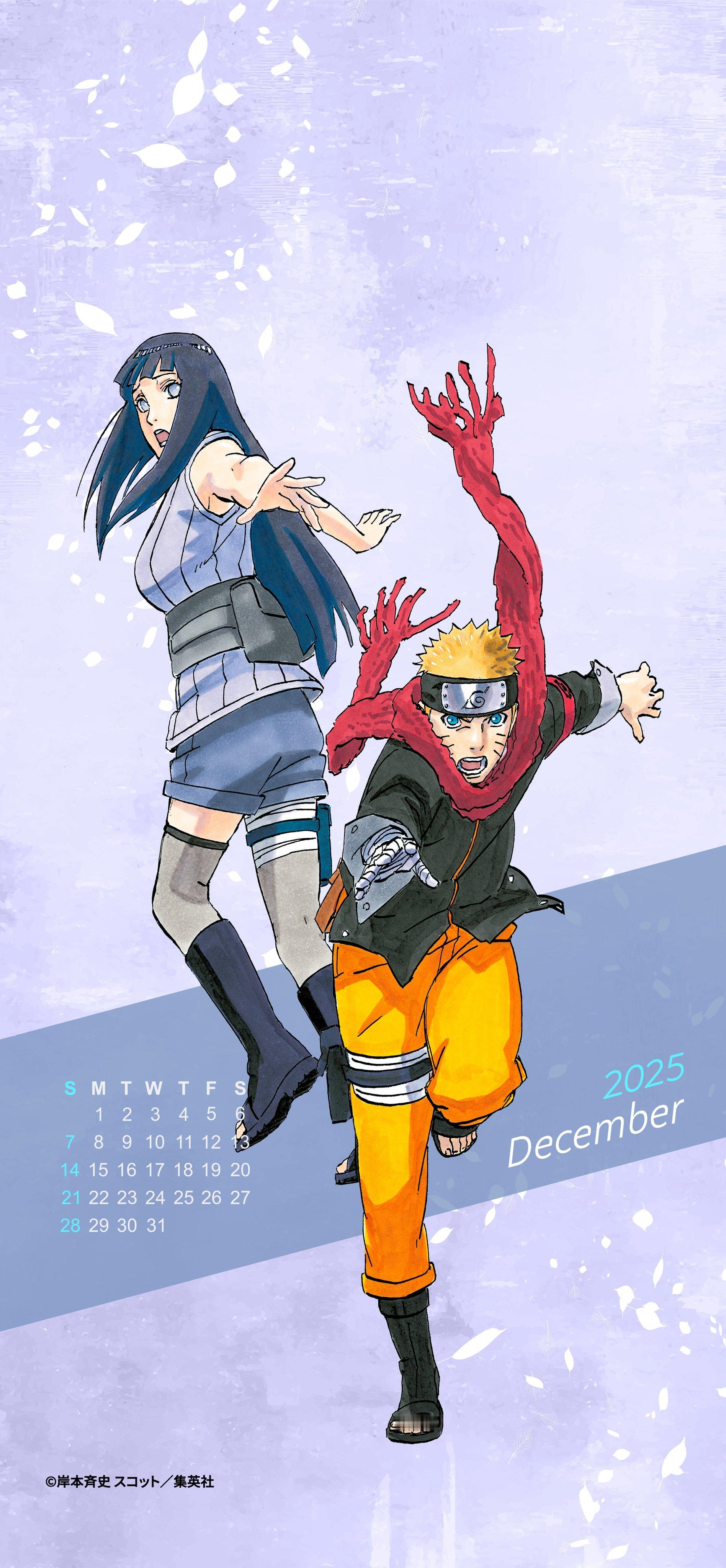 『火影忍者官方』最新发布的2025年12月月历壁纸!(图3图4是不带月历的版本)第一页是鸣人和雏田第二页是佐助和小樱火影忍者鸣雏佐樱