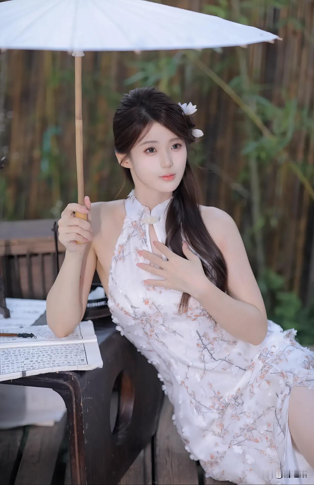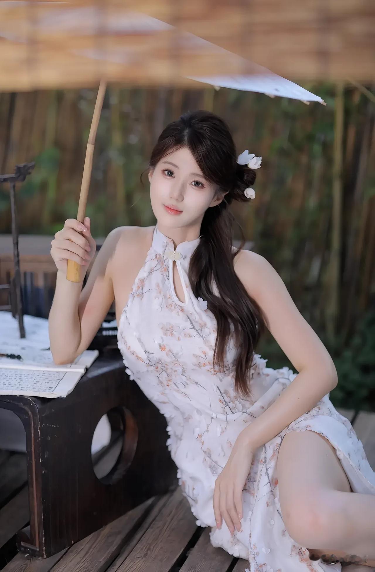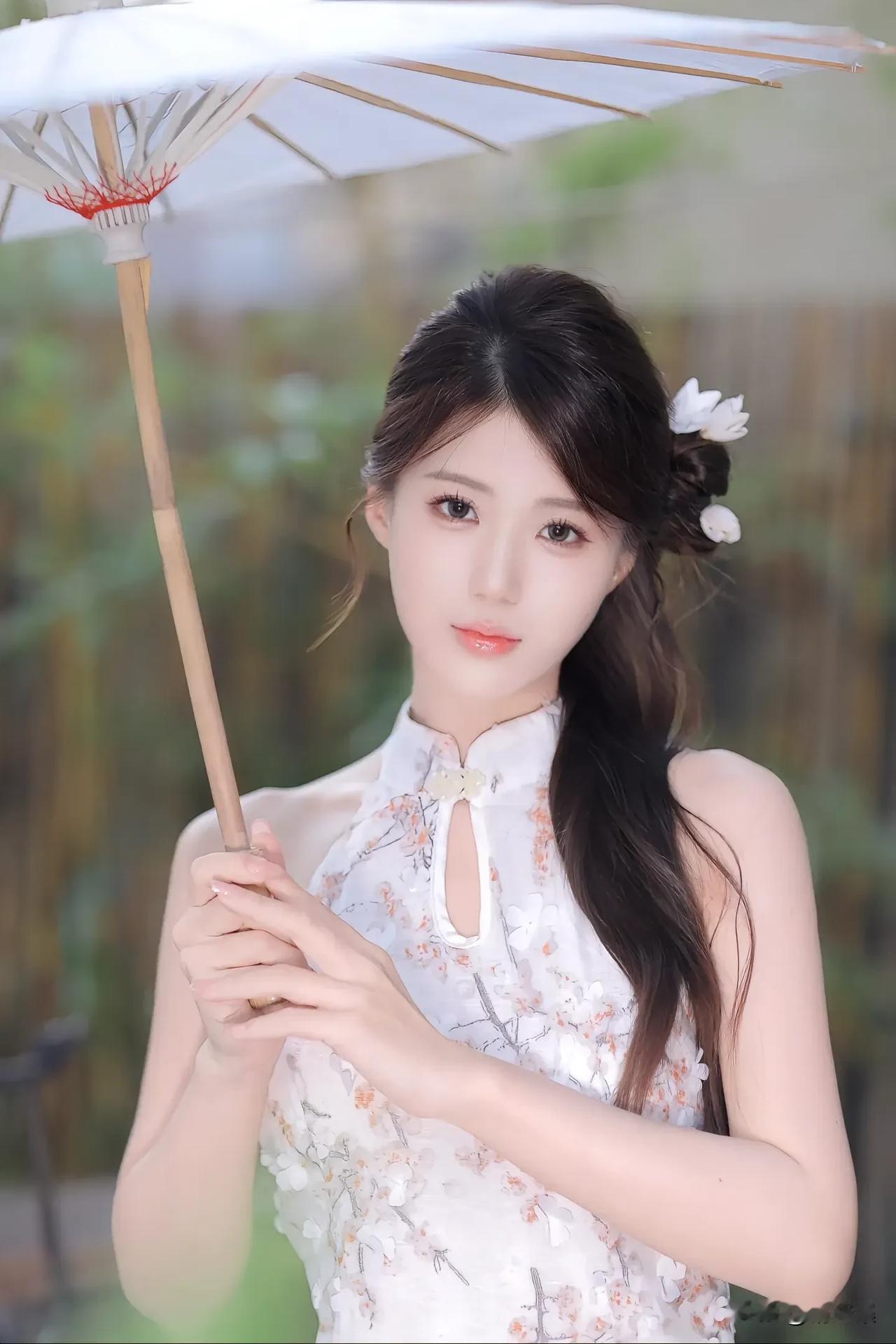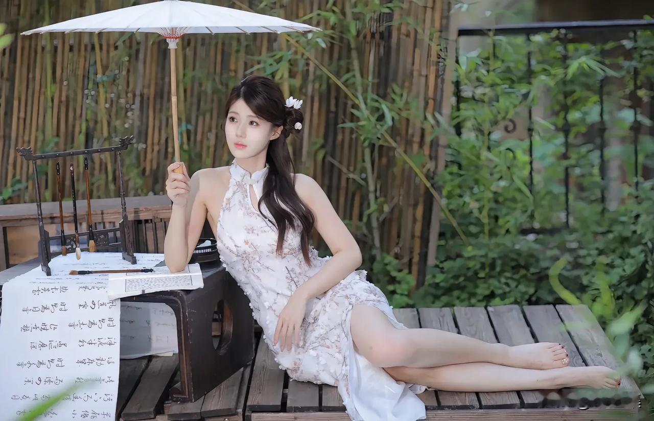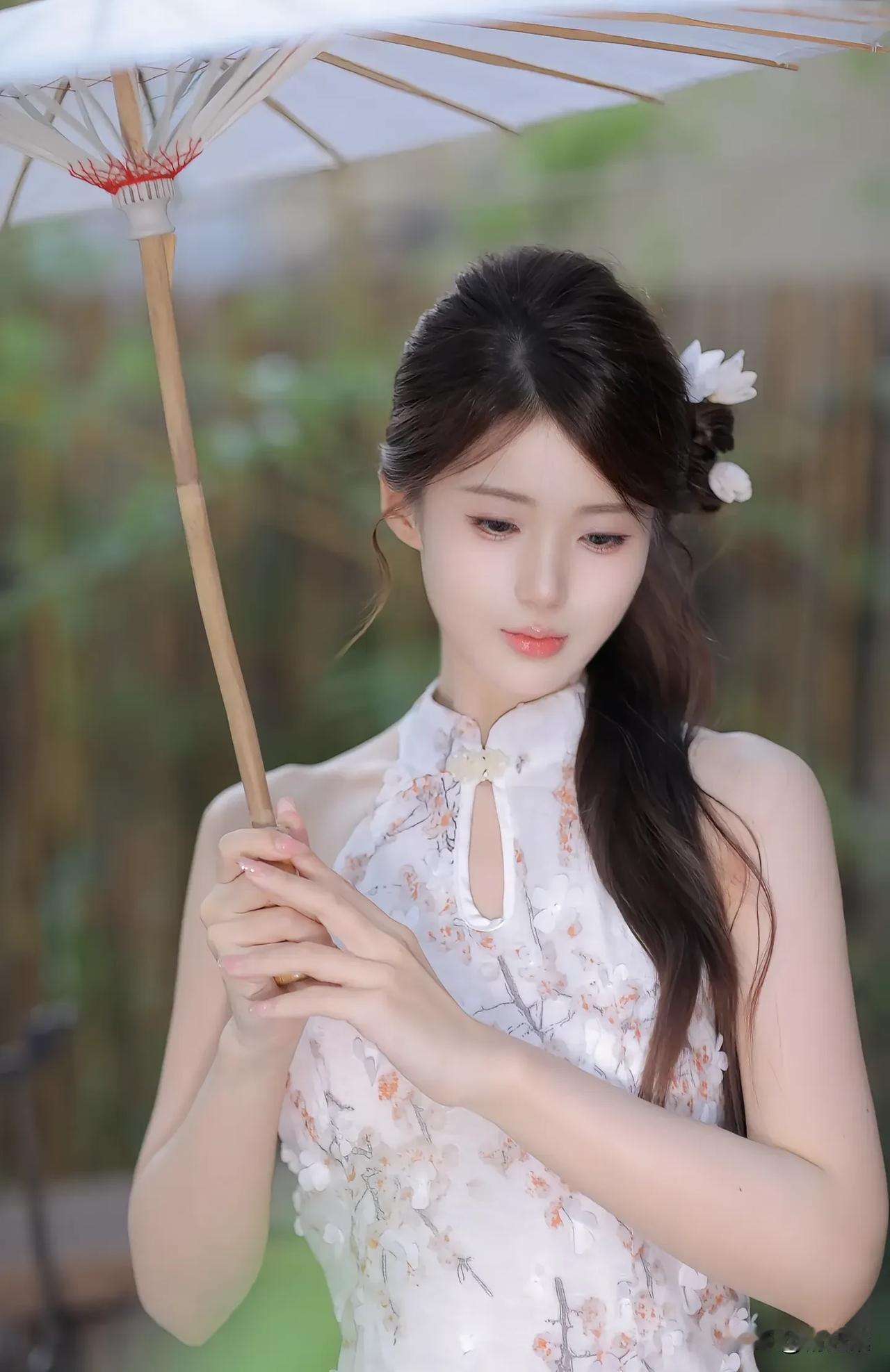 优雅的旗袍美人,撑伞漫步在绿意盎然的庭院中,宛如一幅水墨画。