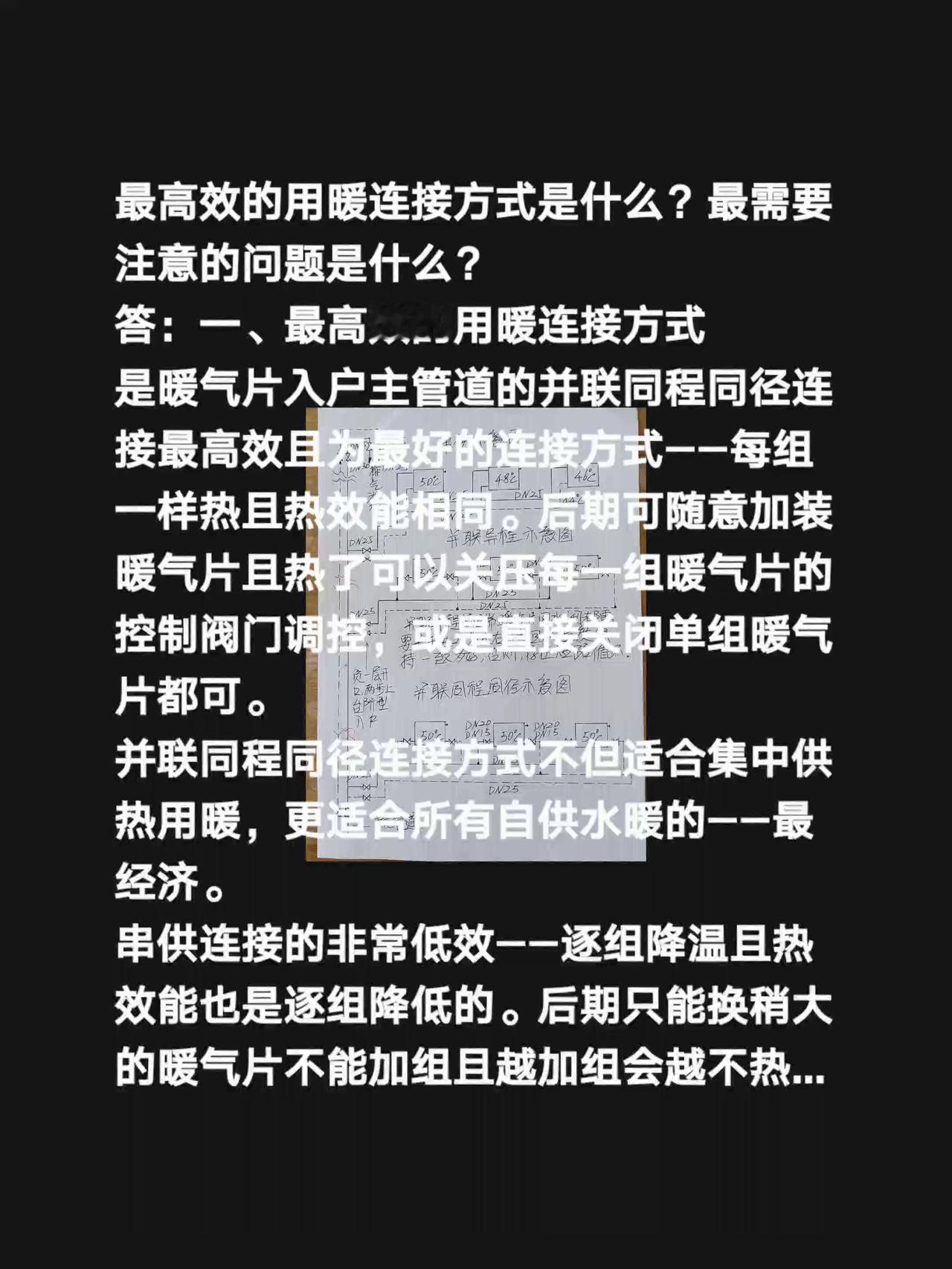 最高效的用暖连接方式是什么?最需要注意的问题是什么? 答:一、最高效的用暖连接方式 是暖气片入户主管道的并联同程同径连接最高效且为最好的连接方式——每组一样热且热效能相同。后期可随意加装暖气片且热了可以关压每一组暖气片的控制阀门调控,或是直接关闭单组暖气片都可。 并联同程同径连接方式不但适合集中供热用暖,更适合所有自供水暖的——最经济。 串供连接的非常低效——逐组降温且热效能也是逐组降低的。后期只能换稍大的暖气片不能加组且越加组会越不热的。 地暖的一旦铺设成型,后期无法加装管路且不能铺设木地板,其无效热损耗也是最高的——给楼下或是地面供热了。 二、连接安装 1、均衡散热很重要 无论是集中供暖,还是自供暖,室内散热设施均衡散热最重要。因而,不论房间大小其散热设施(暖气片、地暖管)必须相同,不得有大小之分,长短之分。大暖气片在小房间的多余热量会在室内被均衡的,且小房间多是背阴的其热量要宁多勿缺。 2、连接安装 暖气片的无论是整楼的还是分户的集中供热用暖,或是自供暖的,户内的用暖设施以并联同程同径连接为最好。 同程同径:这里指的是入户供水主管道与入户回水主管道是反方向铺设的。以6组暖气片为例:第一组暖气片分支管道一侧接供水主管道的最首端,另一侧则是接回水主管道的最末端。第六组暖气片的分支管道则是接供水主管道的最末端,其另一侧接的则是回水主管道的最首端。 3、入户管道上台阶型接入最方便排气 分户最好有负一层开口向上沿地面敷设(上台阶型)或是地埋都可(地暖分配器形式的——八爪鱼方式也可)、千万不要架空(架空排气很难,架空则必须在高点加装DN15以下铜球阀、或是加装手动跑风进行排气),所有暖气片的大小、间距最好一样,暖气片的分支接管必须缩径、异侧进出,并加装两个供、回水球阀控制,一是方便排气(关闭或是一开一关两阀门,用手动跑风即可彻底排除用暖设施内的积气),二是方便调控。 4、调控 这样安装后,室内热了,可关压每组暖气片的回水阀门,甚至是单组关闭。冷了,可继续无限并联接入暖气片。也只有这种并联同程同径高效能连接方式用暖户才有自主并在适当范围调控自家室温的权力,还可对抗极寒天气。 实现了并联同程同径这样的自主调控室温后,智能控的网络达人们,在现有的智能化远程控制技术条件下完全可以实现远程的自我室温调控和监控管理,甚至是自家用热总量的实时管控。 三、最需要注意的问题是 1、开口与入户管道的内径必须相同 切记,无论是片暖的还是地暖的,自单元开口的管道与入户管道的内径要相同——所有塑料材质型号的管材内径都要比热镀锌管的内径小一个型号。 2、水质合格最重要 无论是集中供热用暖,还是自供暖的确保水质合格最重要。比竟水垢的危害性还是非常大的。尤其是自供水暖的全报废的后果损失巨大。暖气片 暖气片安装 暖气片怎么安装既美观又合理 暖气