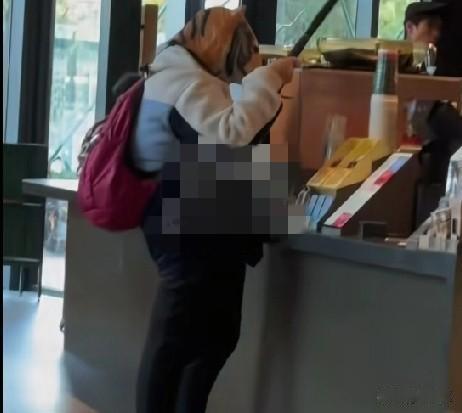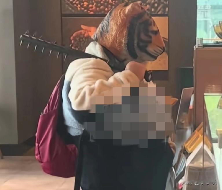 11月30日,浙江宁波一家星巴克里,一女子头戴虎头头罩,在星巴克前台挥舞着狼牙棒