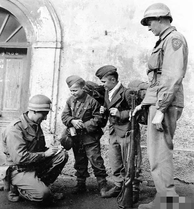 1945年美军俘虏的德军有张照片,两名美宪兵微笑“审问”着两名德军少年兵,这俩娃娃兵是主动投降的。那时的他们只觉得穿上军装又酷又帅,哪懂战争的残酷。被德军蒙蔽,以为自己是正义之师,后来才明白德军是破坏者。 1945年就像一个历史的分水岭,见证着战争的落幕与真相的浮现。