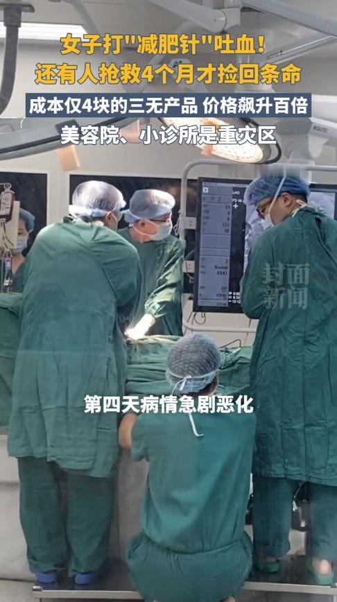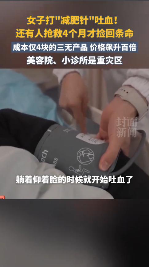 悲剧还是发生了!近日,江苏苏州,一女子为了快速减肥,注射了一支减肥针,不料,女子很快就出现呕吐、反胃、厌食等症状,坚持到第4天,她开始吐绿的、黄的胆汁,送往医院抢救时,女子脉搏都已经停了!网友:这是拿生命冒险。 女人都比较在意体重,渴望拥有完美的身材曲线,但是还不能太胖,想要把身上多余的赘肉全部减掉,于是就开始尝试各种减肥方法,然而,对于药物减肥,一定要慎重,因为很多药品都是“三无”产品。 据媒体11月30日的报道,陈女士一直都在减肥,可是体重却总是反弹,她为此尝试了多种方法,可是效果都不怎么理想。 一次偶然的机会,陈女士看到了减肥针的广告,上面写着,只需注射一支,就能轻松减掉至少7斤肉! 这成功吸引了陈女士的注意,她立即就注射了一支,可是她很快就出现了不适症状,在家里上吐下泻数日后,她实在撑不住了,于是便前往医院医治。 没想到,在病床上检查时,陈女士又开始吐血,随后便陷入了昏迷,幸好医生抢救的及时,这才让她捡回了一条命! 原来,这支减肥针把陈女士的胃折腾的不轻,胃粘膜都被烧没了,险些丢了性命。 大家在减肥时,一定要选取健康的方式,坚持体育锻炼才是最有效的,永远不要相信不用付出努力,就能快速瘦身的方法。 信息来源:《女子打“减肥针”吐血,还有人险些丧命!成本仅4块的三无产品,价格飙升百倍,美容院、小诊所是重灾区》封面新闻