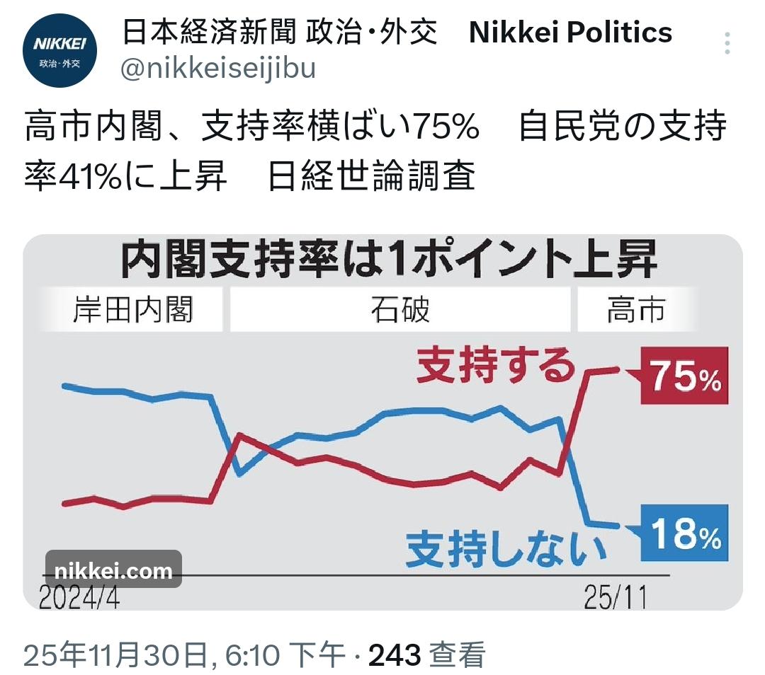 东京电视台和《日本经济新闻》联合进行的民意调查发表,高市早苗内阁的支持率依然处在高位,高达75%,也是连续两个月维持在70%以上,在民众当中很有人气。 11月30日,东京电视台和《日本经济新闻》的联合民调一出来,不少人都留意到高市早苗内阁的支持率还稳稳站在高位,75%的数字不算低,而且已经连续两个月都没掉出70%以上。 这份民调里有个多选题很能说明问题,问民众最期待她的什么政策,选控制通货膨胀的人最多,选外交与安全的排第二,促进经济增长的也有不少人提。 说白了,她能这么受欢迎,核心还是抓准了老百姓最在意的事,手里的钱够不够花,日子过得稳不稳定。 日本这阵子的物价确实让普通人有点扛不住,超市里常买的米面油、菜市场的新鲜蔬菜,还有加一箱汽油,价格都比前两年高了不少。 工资没怎么涨,物价却一个劲往上窜,这种时候谁都希望政府能做点实在的。 高市早苗内阁拿出来的办法也直接,搞了个规模不小的经济刺激计划,里头一大半钱都用在了稳物价和保民生上。 汽油柴油税往下调了些,能源补贴也扩了范围,连未满18岁的孩子都能领到一笔补贴。 更直接的是减税和发钱的承诺,所得税起征点往上提了,不少家庭到手的工资能多一点,这种实打实的好处,老百姓最能直接感受到。 不像有些政策说得天花乱坠,到最后都落不到实处,她这套组合拳刚打出来,不少人就觉得“政府是真的在管我们的死活”。 除了物价,外交和安全也是不少日本民众关心的点,现在周边环境变化快,日本政坛本身也偏向保守,高市早苗在这方面的动作很对不少人的胃口。 她把防卫费提了上去,目标是尽快达到GDP的2%,还打算修订安保相关的文件,强化自卫队的能力。 对外则紧紧靠着美国,跟韩国、澳大利亚这些国家也走得很近,搞所谓的“自由开放的印太”合作。 这种强硬又务实的外交路子,让不少担心安全问题的民众觉得“有靠山、有底气”,自然也愿意给她投信任票。 当然,她的高支持率不只是靠这两件事撑着,更有延续政治路线的功劳。 熟悉日本政坛的都知道,她是安倍晋三路线的坚定继承者,而安倍之前在任时积累的支持者不少,这些人对延续相似政策的高市早苗天然有好感。 加上她跟日本维新会合作后,把不少激进保守派的选票也拢了过来,选民基础比之前扎实了不少。 更关键的是,她的政策方向很明确,不管是经济上的刺激还是安全上的强化,都没有来回摇摆,这种确定性也让民众觉得心里有底,不像有些政府换个政策比翻书还快,老百姓根本摸不准方向。 不过话说回来,这种高支持率能不能长久,其实得打个问号,她搞的扩张性经济政策,发钱减税看着热闹,背后是靠大量财政投入撑着的。 日本本身政府债务就不低,这么大规模的刺激计划,钱要么靠借要么靠印,短期确实能让老百姓拿到实惠,但长期下来很可能会让通胀更难控制,日元贬值的压力也会更大。 之前有些国家也搞过类似的操作,刚开始民众都挺开心,没多久就发现物价涨得更凶,手里的钱反而更不值钱了,也就是常说的“短期爽,长期慌”。 而且外交安全上的强硬路线也有隐忧,防卫费大幅增加,跟周边国家的摩擦可能会变多,一旦出现什么冲突,最终受影响的还是普通老百姓的生活。 现在民众支持这种路线,是因为觉得能带来安全,但真要是局势紧张起来,物价、就业、出行都会受波及,到时候支持率能不能稳住就不好说了。 其实不管哪个国家,老百姓对政府的要求从来都不复杂,就是日子能越过越稳,口袋里的钱能越来越抗造。 高市早苗现在的受欢迎,本质上是她的政策刚好击中了这种需求。 但政策的效果总有滞后性,短期的福利补贴能换来一时的掌声,可要是没法从根本上解决经济增长乏力、物价持续上涨的问题,等新鲜劲过去,民众的不满情绪很可能会慢慢冒出来。 毕竟老百姓心里有杆秤,谁真心为他们办事,办的事能不能长久见效,时间一长就都看明白了。