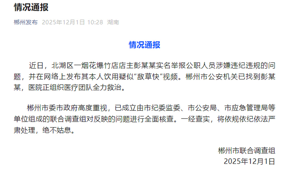 近日,北湖区一烟花爆竹店店主彭某某实名举报公职人员涉嫌违纪违规的问题,并在网络上发布其本人饮用疑似“敌草快”视频。郴州市公安机关已找到彭某某,医院正组织医疗团队全力救治。