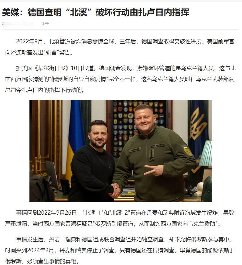 北溪管道被炸一事,终于水落石出了!德国查明了,扎卢日内大将,竟然是北溪管道被炸才是幕后黑手! 2022年9月26日,波罗的海海底传来几声闷响,北溪1号和2号天然气管道相继发生泄漏,海面上升起的甲烷气泡像一群失控的幽灵,这起被称为“史上最大人为温室气体释放事件”的悲剧,终于在三年后迎来关键突破——德国警方的调查铁证指向,乌克兰武装部队前总司令扎卢日内大将,正是这起事件的幕后操盘手。 北溪管道不是普通的能源通道,它是俄罗斯向德国及欧洲输气的核心命脉,单条管线就绵延760英里,曾是德俄能源合作的旗舰项目。 对欧洲来说,它意味着稳定廉价的能源供应;对俄罗斯而言,这是维系与欧洲经济联系的重要杠杆。 管道被炸后,欧洲被迫转向昂贵的美国液化天然气,俄罗斯则直接损失了每年数百亿欧元的收入,全球能源格局就此改写。 起初,西方政客一口咬定是俄罗斯自导自演,克里姆林宫则反过来指责美英是真凶,各方相互攻讦却都拿不出实据,真相被埋在波罗的海的深海里。 德国联邦刑警总局的调查团队没有被政治噪音干扰,他们从最基础的线索查起。 通过追踪船只租赁记录,发现案发前有一艘名为“仙女座号”的单桅帆船在德国罗斯托克港被租用,租船人的身份文件全是伪造的。 这艘只有75马力的老旧帆船,在航行中突然关闭了船舶自动识别系统,彻底从电子海图上消失,这个反常举动让它成了重点目标。 调查人员调取了沿途的监控录像,一张超速摄像头抓拍的照片成了突破口——画面里的船员携带的装备,与深海潜水所需的专业设备完全吻合。 顺着这条线索挖下去,人脸识别技术和跨境信息比对锁定了船员身份,4名乌克兰籍潜水员和3名协调人员浮出水面。 德国检方随后发出逮捕令,其中关键嫌疑人谢尔吉·K在意大利度假时落网,尽管他以绝食抗议试图阻止引渡,但意大利最高法院最终还是批准将其移交德国。 审讯中披露的信息令人震惊:这支精锐小队的行动,全程在扎卢日内的直接监督下进行,从租船、备弹到深海安放炸药,每一个环节都有他的指令。 更让人意外的是,这个袭击计划并非乌克兰最高层的统一决策。 据调查,计划最初在2022年5月的一次酒局上被提出,泽连斯基口头批准后又被美国警告叫停。 但扎卢日内没有执行终止命令,他向总统解释“行动小组已与外界隔绝,无法召回”,实则坚持推进计划并做了细节调整。 这种“先斩后奏”的举动,既体现了他在乌克兰军内的强势地位,也暴露了这一行动背后复杂的利益考量。 对扎卢日内来说,炸掉北溪管道有双重目的:一是彻底切断俄罗斯对欧洲的能源影响力,让欧洲再也没有回头与俄缓和关系的理由;二是将欧洲牢牢绑在援乌战车之上,能源依赖的枷锁被打破后,欧洲对乌援助的顾虑会大大减少。 这个结论让一直援助乌克兰的德国陷入两难。 作为给乌克兰提供最多武器和资金的欧洲国家,自己的关键基础设施却被受援国高层蓄意破坏,德国舆论瞬间炸开了锅。 有匿名的德国高级官员直言,这种规模的袭击本可触发北约集体防御条款,现在却要面对“恩人变仇人”的尴尬处境。 德国政府试图淡化影响,但随着谢尔吉·K被押解回国受审,越来越多细节被披露,民众已经普遍接受了这个残酷的事实。 目前案件还有诸多待解之处,7名嫌疑人中仍有多人逍遥法外,波兰此前逮捕过一名乌克兰籍潜水员,却拒绝引渡给德国,如今此人已被释放,其中是否有政治交易不得而知。 扎卢日内本人虽因健康问题卸任乌军总司令,但他是否会被追责、如何追责,成了考验乌德关系的关键。 联合国安理会应俄罗斯要求召开的公开会上,中方代表耿爽明确表示,国际社会需要一个完整交代,真相不应被掩盖,调查不能被政治化。 这起事件最深刻的影响,在于它彻底撕裂了西方与乌克兰之间的信任纽带。 当德国民众看着自家街头因能源涨价而抗议的人群,再想到炸掉管道的主谋正是他们援助的对象,民意的转向已成必然。 扎卢日内或许以为毁掉管道能巩固乌欧关系,却没想到反而埋下了猜忌的种子。 随着调查的深入,更多幕后细节还会浮出水面,而这起事件给国际社会敲响的警钟已然清晰:任何以“正义”为名破坏民用基础设施的行为,最终都会反噬自身,而真相无论多么迟到,终究不会被永远掩埋。