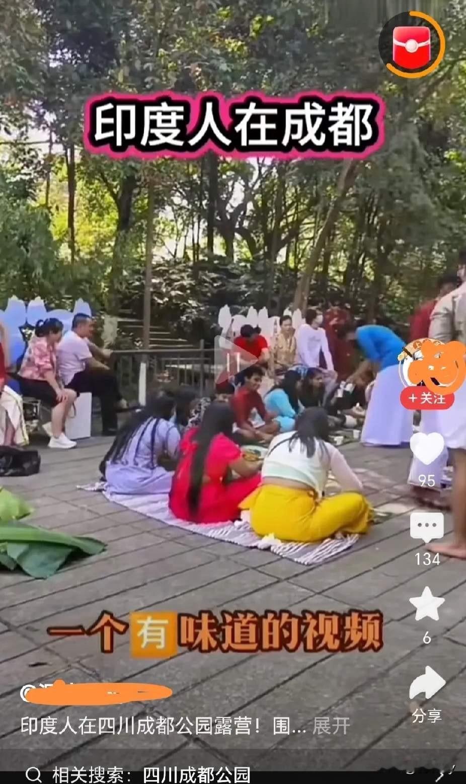 近日,有网友拍到在四川成都的一个公园里,一大群印度人他们带着食材带着锅碗瓢盆聚在一起做饭吃! 他们搭起简易的炉灶,锅里煮着带着咖喱味的印度饭!一群人席地而坐,食材都摆在自己的面前! 一边吃着手抓饭,一边开心的聊着天儿,咖喱饭的味道飘满了整个公园!公园里很多锻炼身体的人都过来围观! 真是太随意了,这饭是想在哪儿吃就在哪儿吃,前一段时间母女两人在地铁里就掏出了饭,不顾及别人的感受,就用手抓着吃! 公园本来就是大家休闲放松的地方,这群人吃完饭后留下的残渣招来了蚂蚁,各种蚊虫!简直就是在污染环境!对他们要立规矩,不能总惯着这种行为了!