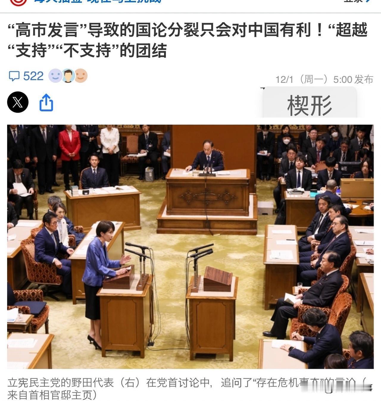 坐不住了!日本表态! 来自日媒最新报道称“高市早苗早苗的错误言论,无论支持不支持都导致日本国内分裂,这样只会有利于中国。” 报道里还提到“台湾问题对中方来说是核心利益,他们正在加强武力使用的可能性,这才是真正的危机事态。” 有评论表示,小日子在我们宝岛问题上从来都是包藏祸心,高市这次摊牌后,就“龟缩”起来不敢出声。我们决不能一了了之,必须要她道歉,正式收回错误言论。