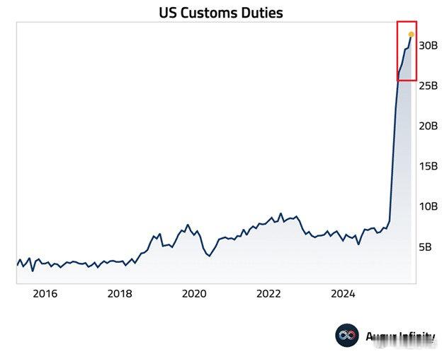 10月美国关税收入同比暴增281%,达342亿美元,创历史新高。截至10月的三个月内,关税及特定消费税合计968亿美元,已超过整个2024财年。2025财年(截至9月30日)关税与消费税总收入为2152亿美元。作为对比,2025财年企业所得税约为4521亿美元。2026财年(始于10月1日)至今,企业所得税仅416亿美元,仅比关税收入高约22%。关税收入正在飙升。