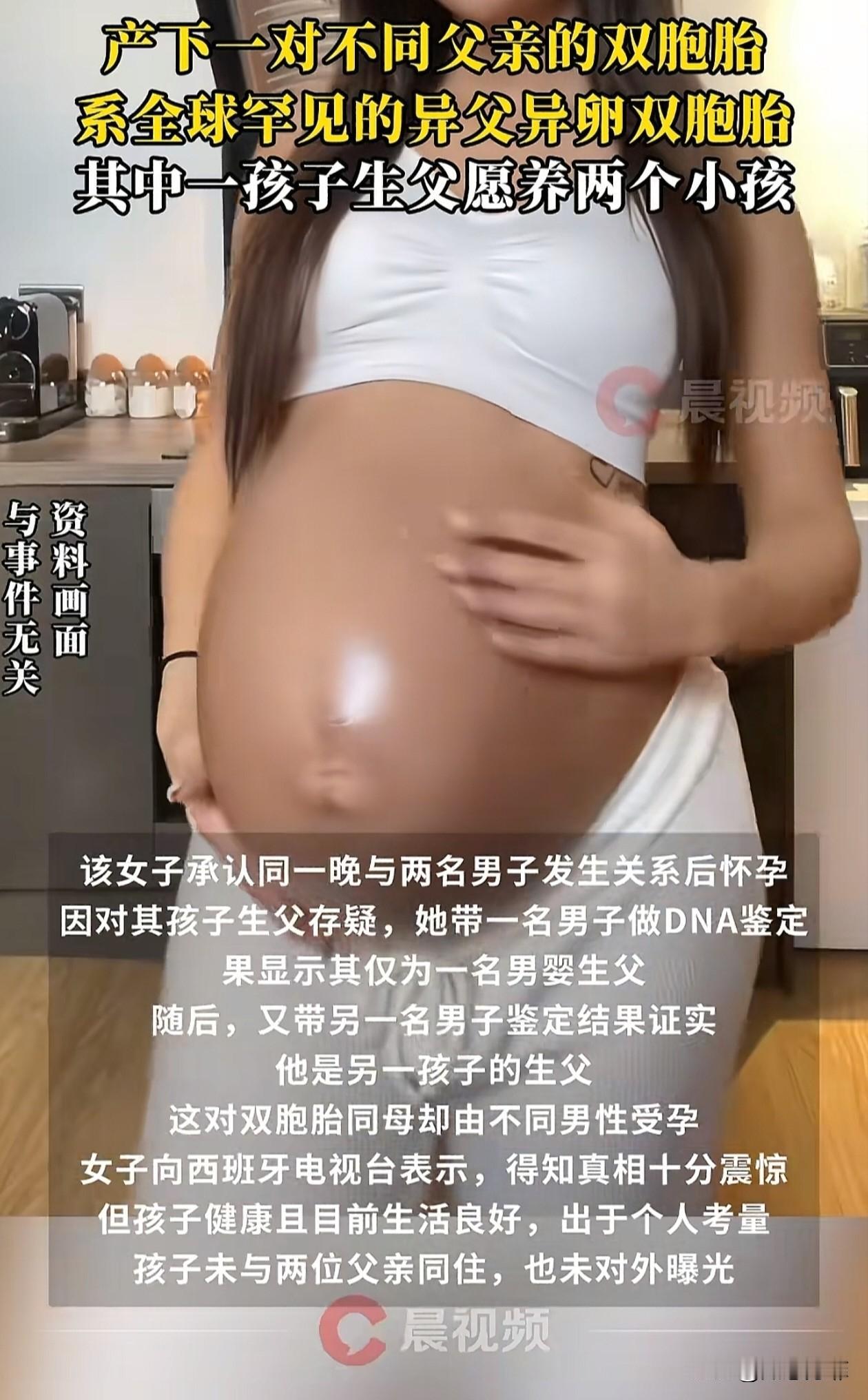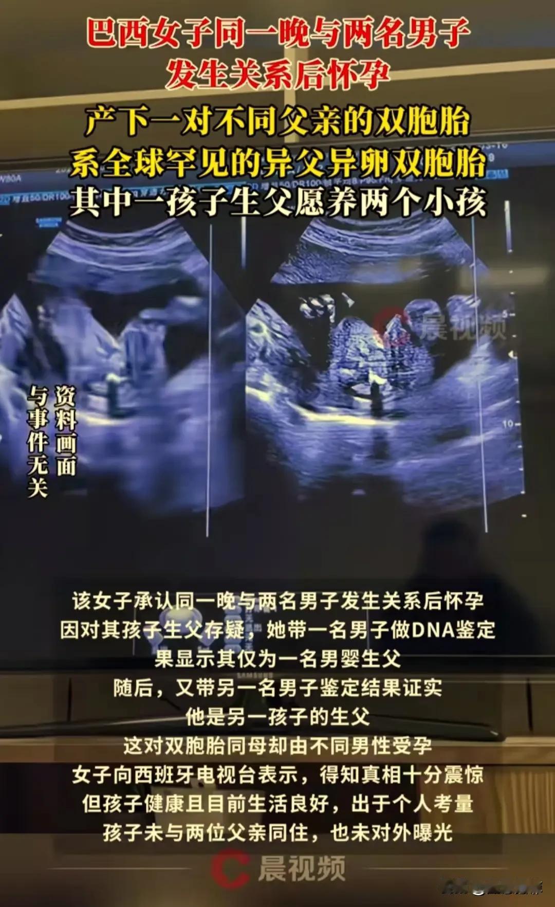巴西,一女子同一天晚上和两名男子发生关系后怀孕,产下一对双胞胎,八个月后亲子鉴定时,竟发现两个孩子父亲不同,系全球罕见的异父异卵双胞胎,其中一个孩子的生父愿意养两个孩子。 女子生下双胞胎后,很开心,可等孩子长到八个月大时,她感觉不太对劲。 两个孩子的肤色和五官都有明显差异,再加上她记得自己受孕那晚曾跟两名男子有过无保护亲密接触,于是找到其中一个男子去做亲子鉴定。 结果显示,这名男子只跟其中一个孩子有亲子关系,她又赶紧找到另一名男子做鉴定,最后确认他就是另一个孩子的生父。 医生表示,这种现象叫“异父异卵超受精”,就是女子排卵期时,身体一次性排了两颗卵子,且在短时间内,刚好和两名男人的精子分别结合,形成了两个独立的受精卵,最终在子宫内各自发育为胎儿。 后来女子为了保护孩子的隐私,没有让孩子与两位生父同住。但其中一名生父选择承担全部责任,不仅将两个孩子正式登记为自己的子女,还一直提供经济支持与情感陪伴。 现在两个孩子都健健康康的,生活过得很安稳。 网友们都觉得太神奇了,感叹生命的巧合,说这简直是现实版的离谱剧情,比电视剧还魔幻,也第一次知道还有这种罕见的生育情况。 那位主动养两个孩子的父亲值得点赞,真正的父爱跟血缘没关系,责任和担当才更重要,这份超越血缘的照顾特别珍贵。