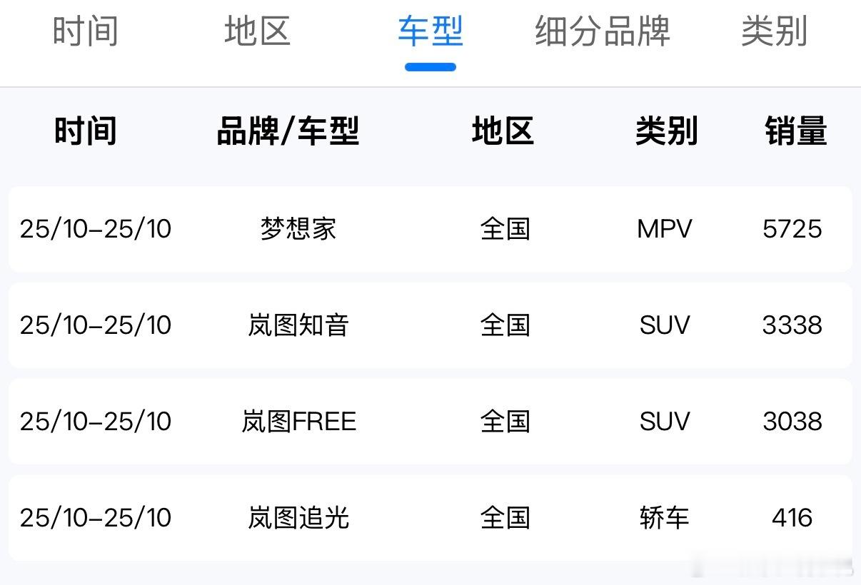 岚图11月销量20005辆,擦边过两万辆。参考下10月1.25万年左右的上牌量,10月岚图报的批售销量是1.72万辆。自己查了一下,岚图1-10月上报批售量为11.2万辆,上牌辆为9.5万辆,其中武汉上牌量2.16万辆为。那么11月销量除了岚图泰山可能带来批售增长外,不知道其他车销量表现怎么样,蹲一个详细数据。汽场全开大v聊车