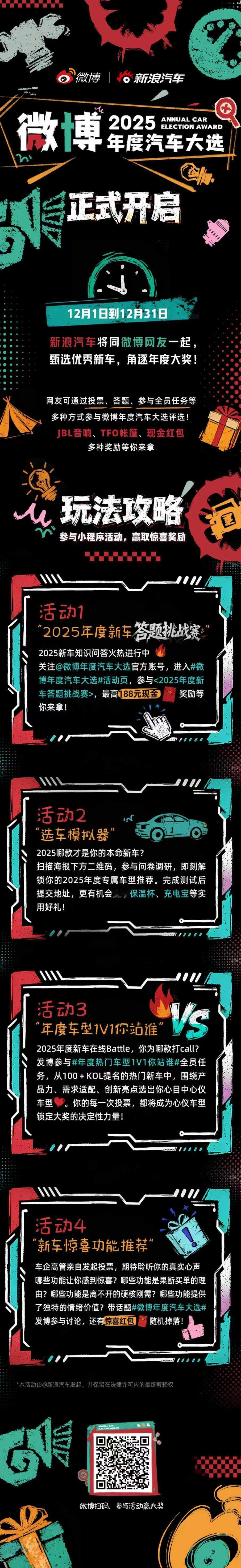 🚗🚗🚗看见用户所见,选择用户所选——2025微博年度汽车大选正式开启! 点击链接或扫描二维码参与活动赢大奖!活动通道:微博年度汽车大选