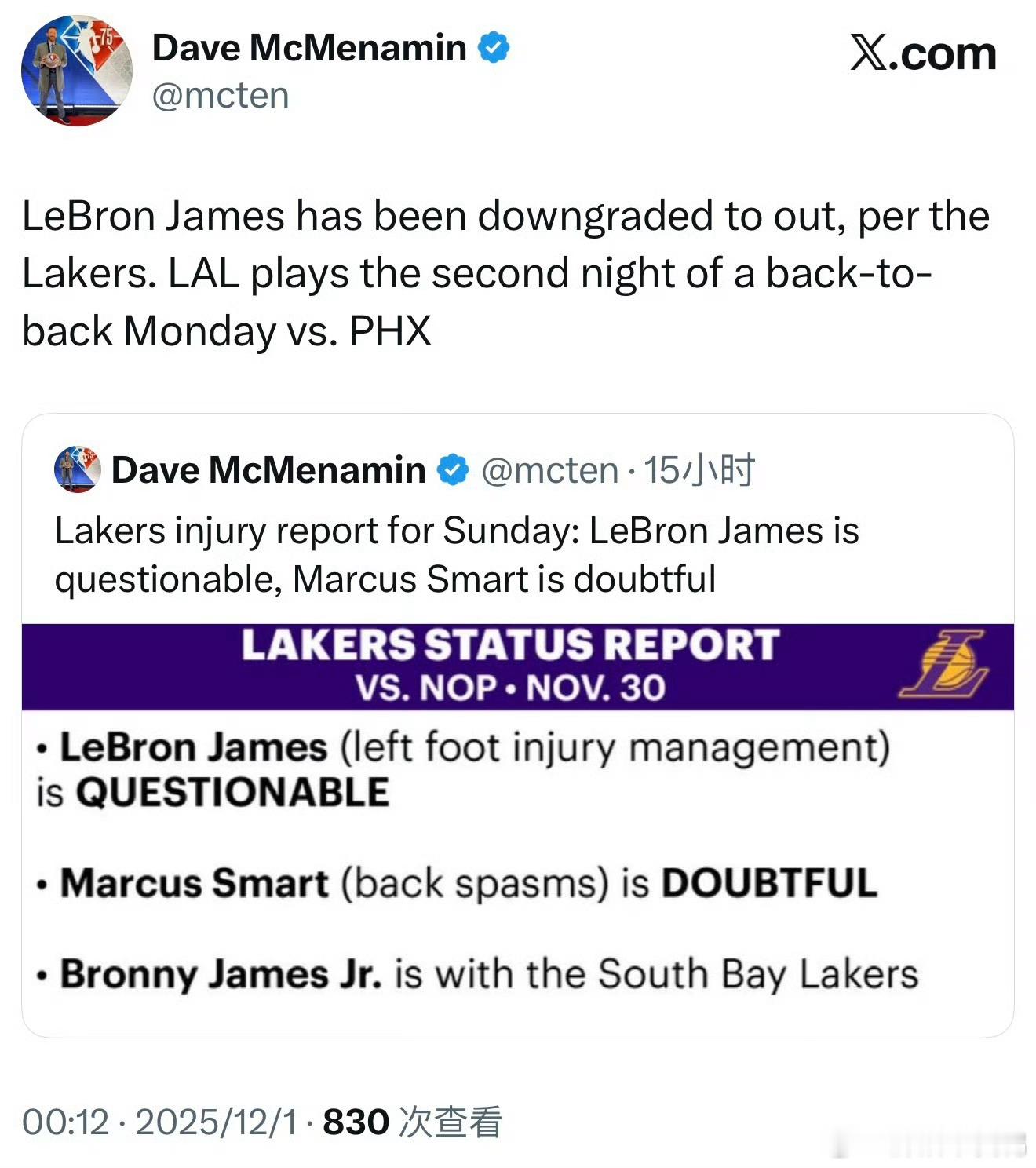 根据湖人官方最新的消息,詹姆斯已确认将缺席今天湖人对阵鹈鹕的比赛,原因是左脚伤病管理。这次脚踝伤势是在前几天对战快船的比赛中受影响的。那场比赛,詹姆斯在一次快攻上篮落地后,就一直感觉脚踝不适,在篮板下缓了一会,最后他还是坚持打完了比赛,据说,这次脚踝伤势是詹姆斯那支经常受伤的脚。其实这次伤势要追溯到21年,詹姆斯就是因为在那一年脚踝扭伤,导致他状态逐步下滑的,自从那一次受伤后,巅峰詹姆斯就已经不复存在了!詹姆斯此前在因左臀坐骨神经痛缺席了很长一段时间,这次缺席也导致詹姆斯职业生涯首次缺席常规赛揭幕战跟前14场比赛!在詹姆斯复出后,他参加了4场比赛,湖人在这4场比赛中取得了全胜的战绩。在这4场比赛中,詹姆斯场均出战32.5分钟,能够得到16.5分5篮板和8.3助攻,投篮命中率为49%。他的场均出手数(13.3次)和回合占有率(21.9%)均创下生涯新低,在这四场比赛,他分别拿下11分12助攻,17分8助攻,25分6助攻,13分7助攻,詹姆斯在复出后转型为球队的无球发动者,他不再去追求强行出手,而是把精力放在无球端跟串联队友以及防守方面!在詹姆斯回归后,他为湖人带来了立竿见影的效果!在复出后的4场比赛里,湖人队场均得分高达128分,进攻效率高居联盟第二。而且在他的穿针引线下,队友小里的场均得分从不仅没有下降,反而上涨了,这就是因为詹姆斯替里弗斯承担了组织压力,好让他把注意力都放在进攻端!而中锋艾顿在与詹姆斯一同出战的比赛中命中率高达72%,顿宝都被詹姆斯喂撑了吧!在詹姆斯复出后,他也为湖人提供了之前缺乏的突破威胁和快攻发起能力,湖人的快攻得分从联盟倒数提升至前列(在这四场比赛里)。詹姆斯通过这4场比赛,正式开启了自己职业生涯的第23个NBA赛季,这使他成为NBA历史上首位达到这一成就的球员,超越了文斯卡特的22个赛季,成为NBA最老的球员了!看过湖人比赛的都知道詹姆斯在复出后最显著的改变就是主动退居,当三当家的角色,并在进攻端大幅增加无球打法。他现在更多地让东契奇和里夫斯去主导进攻,自己则通过无球跑动、接应和防守端的指挥来帮助球队,就是詹姆斯这种无私的打法成功维系了球队的化学反应。但是詹姆斯此次休战是他本赛季缺席的第15场比赛。根据NBA规定,球员必须至少出战65场常规赛才有资格参与赛季个人奖项的评选(如MVP、最佳阵容等)。这就意味着,在剩余的赛程中,詹姆斯的缺阵场次最多不能超过两场,否则将自动失去评奖资格。这次休战也反映了湖人管理层对于这位即将41岁的老将谨慎使用的策略,旨在确保其健康问题,以好应对漫长的赛季,对于目前詹姆斯而言,或许保持健康的打球比任何奖项都重要!毕竟詹姆斯还是想要在生涯末年继续尝到总冠军的滋味。老头的复出虽然在数据上不再像巅峰时期那样耀眼,但他通过自己的成功转型,甘愿牺牲自己来确保球队的化学反应,这对于詹姆斯本人以及队友来说都是有利的帮助!湖人今天打鹈鹕拿下7连胜应该问题不大,老头就好好休息吧,有东契奇跟里弗斯帮你撑腰!东契奇最喜欢的球员是詹姆斯湖人詹姆斯